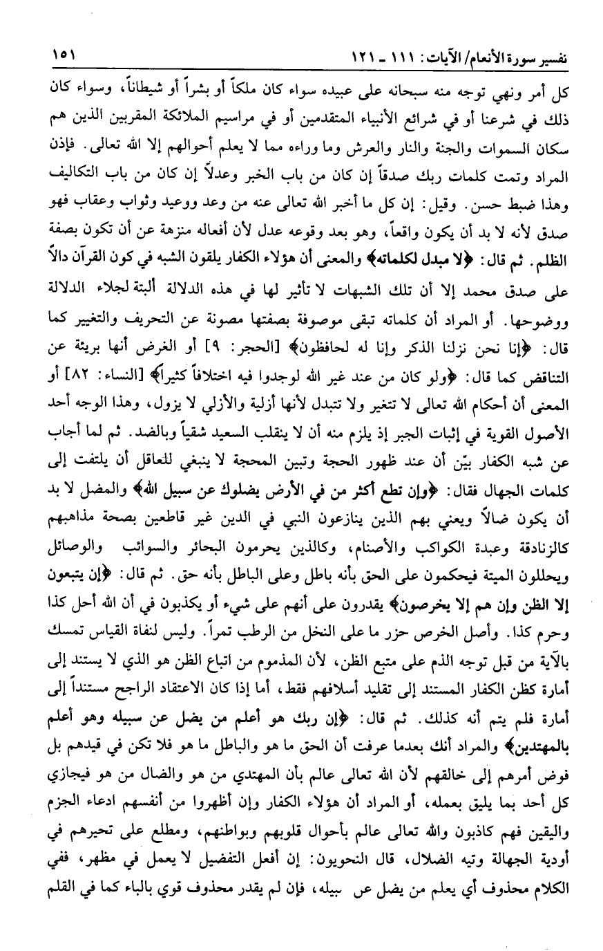 كل أمر ونهي توجه منه سبحانه على عبيده سواء كان ملكا أو بشرا أو شيطانا، وسواء كان ذلك في شرعنا أو في شرائع الأنبياء المتقدمين أو في مراسيم الملائكة المقربين الذين هم سكان السموات والجنة والنار والعرش وما وراءه مما لا يعلم أحوالهم إلا الله تعالى. فإذن المراد وتمت كلمات ربك صدقا إن كان من باب الخبر وعدلا إن كان من باب التكاليف وهذا ضبط حسن. وقيل: إن كل ما أخبر الله تعالى عنه من وعد ووعيد وثواب وعقاب فهو صدق لأنه لا بد أن يكون واقعا، وهو بعد وقوعه عدل لأن أفعاله منزهة عن أن تكون بصفة الظلم. ثم قال: لا مُبَدِّلَ لِكَلِماتِهِ والمعنى أن هؤلاء الكفار يلقون الشبه في كون القرآن دالا على صدق محمد إلا أن تلك الشبهات لا تأثير لها في هذه الدلالة البتة لجلاء الدلالة ووضوحها. أو المراد أن كلماته تبقى موصوفة بصفتها مصونة عن التحريف والتغيير كما قال: إِنَّا نَحْنُ نَزَّلْنَا الذِّكْرَ وَإِنَّا لَهُ لَحافِظُونَ [الحجر: 9] أو الغرض أنها بريئة عن التناقض كما قال: وَلَوْ كانَ مِنْ عِنْدِ غَيْرِ اللَّهِ لَوَجَدُوا فِيهِ اخْتِلافاً كَثِيراً [النساء: 82] أو المعنى أن أحكام الله تعالى لا تتغير ولا تتبدل لأنها أزلية والأزلي لا يزول، وهذا الوجه أحد الأصول القوية في إثبات الجبر إذ يلزم منه أن لا ينقلب السعيد شقيا وبالضد. ثم لما أجاب عن شبه الكفار بيّن أن عند ظهور الحجة وتبين المحجة لا ينبغي للعاقل أن يلتفت إلى كلمات الجهال فقال: وَإِنْ تُطِعْ أَكْثَرَ مَنْ فِي الْأَرْضِ يُضِلُّوكَ عَنْ سَبِيلِ اللَّهِ والمضل لا بد أن يكون ضالا ويعني بهم الذين ينازعون النبي في الدين غير قاطعين بصحة مذاهبهم كالزنادقة وعبدة الكواكب والأصنام، وكالذين يحرمون البحائر والسوائب والوصائل ويحللون الميتة فيحكمون على الحق بأنه باطل وعلى الباطل بأنه حق. ثم قال: إِنْ يَتَّبِعُونَ إِلَّا الظَّنَّ وَإِنْ هُمْ إِلَّا يَخْرُصُونَ يقدرون على أنهم على شيء أو يكذبون في أن الله أحل كذا وحرم كذا. وأصل الخرص حزر ما على النخل من الرطب تمرا. وليس لنفاة القياس تمسك بالآية من قبل توجه الذم على متبع الظن، لأن المذموم من اتباع الظن هو الذي لا يستند إلى أمارة كظن الكفار المستند إلى تقليد أسلافهم فقط، أما إذا كان الاعتقاد الراجح مستندا إلى أمارة فلم يتم أنه كذلك. ثم قال: إِنَّ رَبَّكَ هُوَ أَعْلَمُ مَنْ يَضِلُّ عَنْ سَبِيلِهِ وَهُوَ أَعْلَمُ بِالْمُهْتَدِينَ والمراد أنك بعد ما عرفت أن الحق ما هو والباطل ما هو فلا تكن في قيدهم بل فوض أمرهم إلى خالقهم لأن الله تعالى عالم بأن المهتدي من هو والضال من هو فيجازي كل أحد بما يليق بعمله، أو المراد أن هؤلاء الكفار وإن أظهروا من أنفسهم ادعاء الجزم واليقين فهم كاذبون والله تعالى عالم بأحوال قلوبهم وبواطنهم، ومطلع على تحيرهم في أودية الجهالة وتيه الضلال، قال النحويون: إن أفعل التفضيل لا يعمل في مظهر، ففي الكلام محذوف أي يعلم من يضل عن سبيله، فإن لم يقدر محذوف قوي