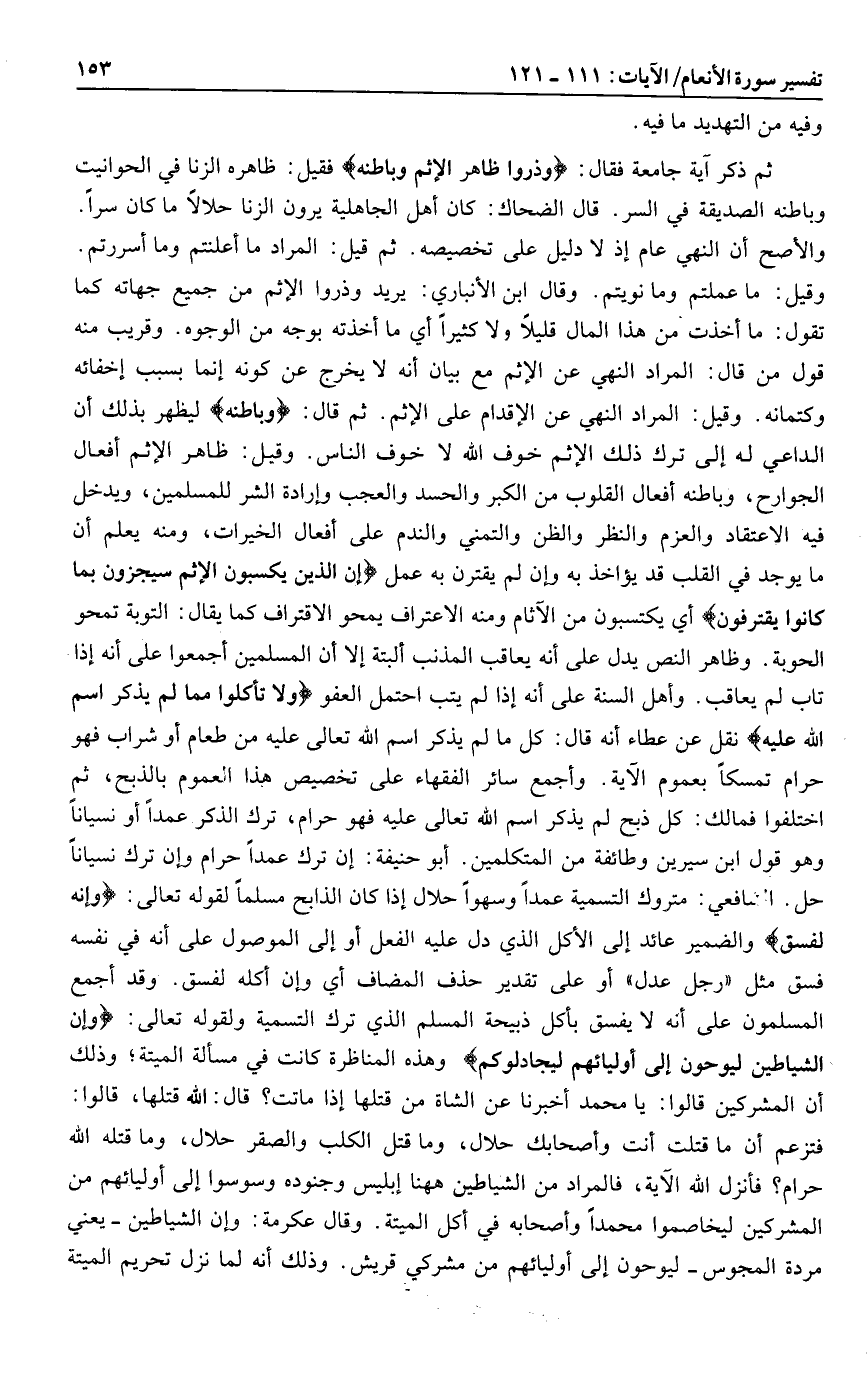 وقيل: ما عملتم وما نويتم. وقال ابن الأنباري: يريد وذروا الإثم من جميع جهاته كما تقول: ما أخذت من هذا المال قليلا ولا كثيرا أي ما أخذته بوجه من الوجوه. وقريب منه قول من قال: المراد النهي عن الإثم مع بيان أنه لا يخرج عن كونه إنما بسبب إخفائه وكتمانه. وقيل: المراد النهي عن الإقدام على الإثم. ثم قال: وَباطِنَهُ ليظهر بذلك أن الداعي له إلى ترك ذلك الإثم خوف الله لا خوف الناس. وقيل: ظاهر الإثم أفعال الجوارح، وباطنه أفعال القلوب من الكبر والحسد والعجب وإرادة الشر للمسلمين، ويدخل فيه الاعتقاد والعزم والنظر والظن والتمني والندم على أفعال الخيرات، ومنه يعلم أن ما يوجد في القلب قد يؤاخذ به وإن لم يقترن به عمل إِنَّ الَّذِينَ يَكْسِبُونَ الْإِثْمَ سَيُجْزَوْنَ بِما كانُوا يَقْتَرِفُونَ أي يكتسبون من الآثام ومنه الاعتراف يمحو الاقتراف كما يقال: التوبة تمحو الحوبة. وظاهر النص يدل على أنه يعاقب المذنب البتة إلا أن المسلمين أجمعوا على أنه إذا تاب لم يعاقب. وأهل السنة على أنه إذا لم يتب احتمل العفو وَلا تَأْكُلُوا مِمَّا لَمْ يُذْكَرِ اسْمُ اللَّهِ عَلَيْهِ نقل عن عطاء أنه قال: كل ما لم يذكر اسم الله تعالى عليه من طعام أو شراب فهو حرام تمسكا بعموم الآية. وأجمع سائر الفقهاء على تخصيص هذا العموم بالذبح، ثم اختلفوا فمالك: كل ذبح لم يذكر اسم الله تعالى عليه فهو حرام، ترك الذكر عمدا أو نسيانا وهو قول ابن سيرين وطائفة من المتكلمين. أبو حنيفة: إن ترك عمدا حرام وإن ترك نسيانا حل. الشافعي: متروك التسمية عمدا وسهوا حلال إذا كان الذابح مسلما لقوله تعالى: وَإِنَّهُ لَفِسْقٌ والضمير عائد إلى الأكل الذي دل عليه الفعل أو إلى الموصول على أنه في نفسه فسق مثل «رجل عدل» أو على تقدير حذف المضاف أي وإن أكله لفسق. وقد أجمع المسلمون على أنه لا يفسق بأكل ذبيحة المسلم الذي ترك التسمية ولقوله تعالى: وَإِنَّ الشَّياطِينَ لَيُوحُونَ إِلى أَوْلِيائِهِمْ لِيُجادِلُوكُمْ وهذه المناظرة كانت في مسألة الميتة