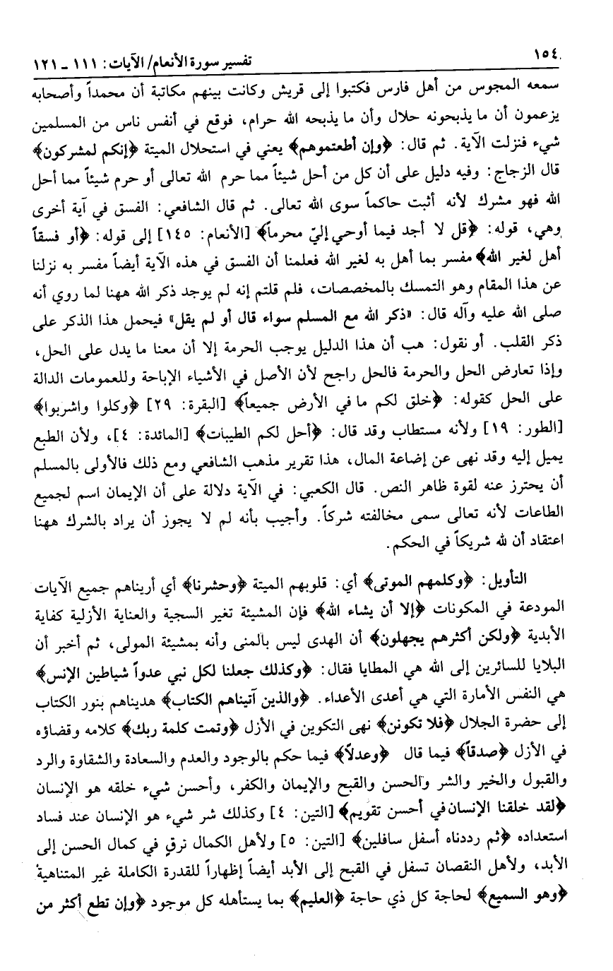 فيحمل هذا الذكر على ذكر القلب. أو نقول: هب أن هذا الدليل يوجب الحرمة إلا أن معنا ما يدل على الحل، وإذا تعارض الحل والحرمة فالحل راجح لأن الأصل في الأشياء الإباحة وللعمومات الدالة على الحل كقوله: خَلَقَ لَكُمْ ما فِي الْأَرْضِ جَمِيعاً [البقرة: 29] كُلُوا وَاشْرَبُوا [الطور: 19] ولأنه مستطاب وقد قال: أُحِلَّ لَكُمُ الطَّيِّباتُ [المائدة: 4] ، ولأن الطبع يميل إليه وقد نهى عن إضاعة المال، هذا تقرير مذهب الشافعي ومع ذلك فالأولى بالمسلم أن يحترز عنه لقوة ظاهر النص. قال الكعبي: في الآية دلالة على أن الإيمان اسم لجميع الطاعات لأنه تعالى سمى مخالفته شركا. وأجيب بأنه لم لا يجوز أن يراد بالشرك هاهنا اعتقاد أن لله شريكا في الحكم.