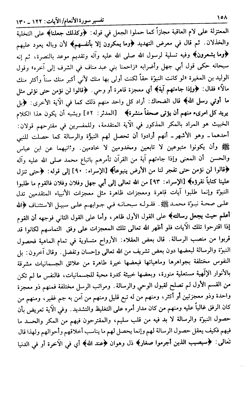 المعتزلة على لام العاقبة مجازا كما حملوا الجعل في قوله: وَكَذلِكَ جَعَلْنا على التخلية والخذلان. ثم قال في معرض التهديد وَما يَمْكُرُونَ إِلَّا بِأَنْفُسِهِمْ لأن وباله يعود عليهم وَما يَشْعُرُونَ وفيه تسلية لرسول الله صلى الله عليه وآله وتقديم موعد بالنصرة، ثم إنه سبحانه حكى قول أبي جهل وأضرابه «زاحمنا بني عبد مناف في الشرف إلى آخره» وقول الوليد بن المغيرة «لو كانت النبوّة حقا لكنت أولى بها منك لأني أكبر منك سنا وأكثر منك مالا» فقال: وَإِذا جاءَتْهُمْ آيَةٌ أي معجزة قاهرة أو وحي. قالُوا لَنْ نُؤْمِنَ حَتَّى نُؤْتى مِثْلَ ما أُوتِيَ رُسُلُ اللَّهِ قال الضحاك: أراد كل واحد منهم ذلك كما في الآية الأخرى: بَلْ يُرِيدُ كُلُّ امْرِئٍ مِنْهُمْ أَنْ يُؤْتى صُحُفاً مُنَشَّرَةً [المدثر: 52] ويشبه أن يكون هذا الكلام الخبيث هو المراد بالمكر المذكور في الآية المتقدمة، وللمفسرين في مقترحهم قولان:
