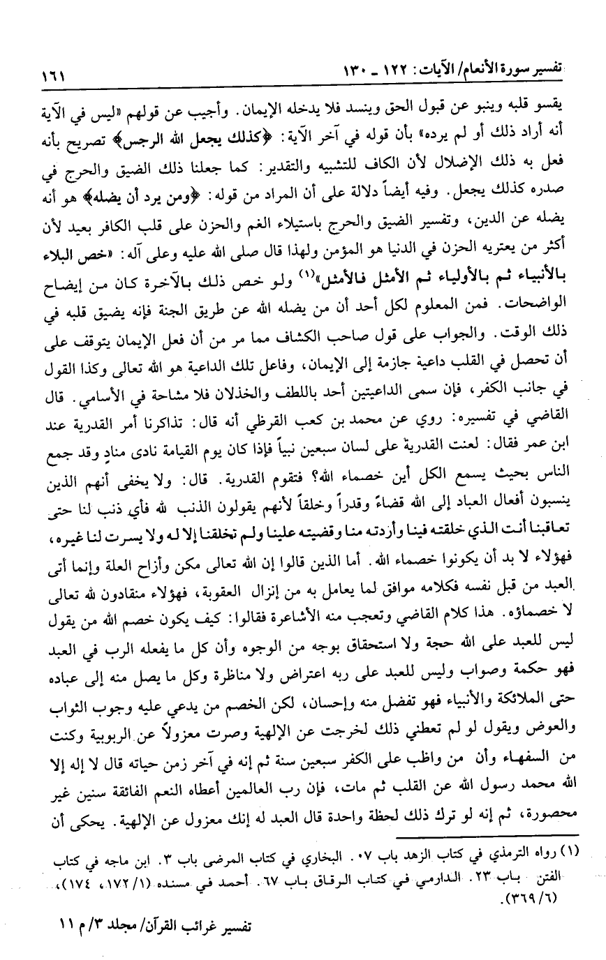 ولو خص ذلك بالآخرة كان من إيضاح الواضحات. فمن المعلوم لكل أحد أن من يضله الله عن طريق الجنة فإنه يضيق قلبه في ذلك الوقت. والجواب على قول صاحب الكشاف مما مر من أن فعل الإيمان يتوقف على أن تحصل في القلب داعية جازمة إلى الإيمان، وفاعل تلك الداعية هو الله تعالى وكذا القول في جانب الكفر، فإن سمى الداعيتين أحد باللطف والخذلان فلا مشاحة في الأسامي. قال القاضي في تفسيره: روي عن محمد بن كعب القرظي أنه قال: تذاكرنا أمر القدرية عند ابن عمر فقال: لعنت القدرية على لسان سبعين نبيا فإذا كان يوم القيامة نادى مناد وقد جمع الناس بحيث يسمع الكل أين خصماء الله؟ فتقوم القدرية. قال: ولا يخفى أنهم الذين ينسبون أفعال العباد إلى الله قضاء وقدرا وخلقا لأنهم يقولون الذنب لله فأي ذنب لنا حتى تعاقبنا أنت الذي خلقته فينا وأردته منا وقضيته علينا ولم تخلقنا إلا له ولا يسرت لنا غيره، فهؤلاء لا بد أن يكونوا خصماء الله. أما الذين قالوا إن الله تعالى مكن وأزاح العلة وإنما أتى العبد من قبل نفسه فكلامه موافق لما يعامل به من إنزال العقوبة، فهؤلاء منقادون لله تعالى لا خصماؤه. هذا كلام القاضي وتعجب منه الأشاعرة فقالوا: كيف يكون خصم الله من يقول ليس للعبد على الله حجة ولا استحقاق بوجه من الوجوه وأن كل ما يفعله الرب في العبد فهو حكمة وصواب وليس للعبد على ربه اعتراض ولا مناظرة وكل ما يصل منه إلى عباده حتى الملائكة والأنبياء فهو تفضل منه وإحسان، لكن الخصم من يدعي عليه وجوب الثواب والعوض ويقول لو لم تعطني ذلك لخرجت عن الإلهية وصرت معزولا عن الربوبية وكنت من السفهاء وأن من واظب على الكفر سبعين سنة ثم إنه في آخر زمن حياته قال لا إله إلا الله محمد رسول الله عن القلب ثم مات، فإن رب العالمين أعطاه النعم الفائقة سنين غير محصورة، ثم إنه لو ترك ذلك لحظة واحدة قال العبد له إنك معزول عن الإلهية. يحكى أن