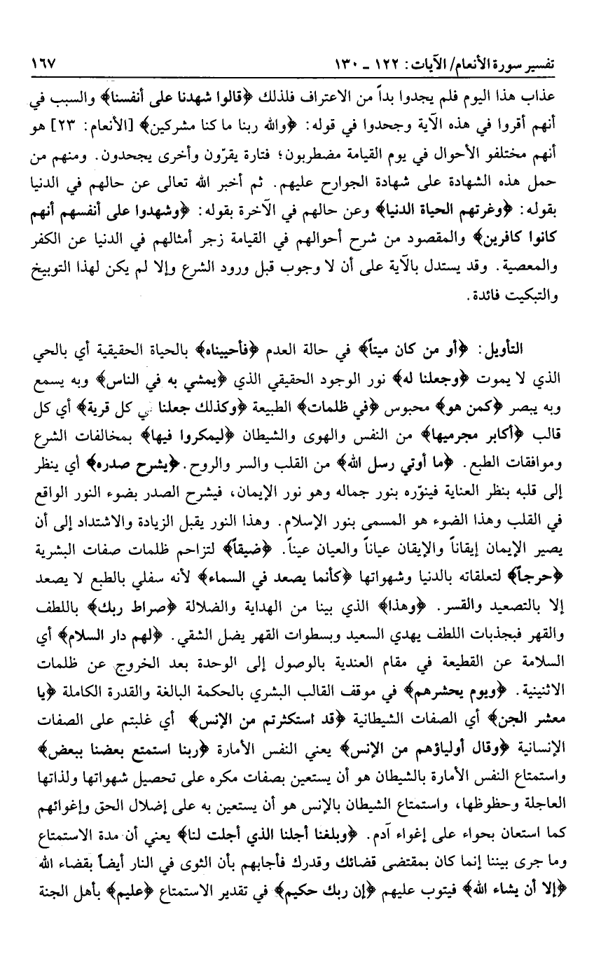أَوَمَنْ كانَ مَيْتاً في حالة العدم فَأَحْيَيْناهُ بالحياة الحقيقية أي بالحي الذي لا يموت وَجَعَلْنا لَهُ نور الوجود الحقيقي الذي يَمْشِي بِهِ فِي النَّاسِ وبه يسمع وبه يبصر كَمَنْ هو محبوس فِي الظُّلُماتِ الطبيعة وَكَذلِكَ جَعَلْنا فِي كُلِّ قَرْيَةٍ أي كل قالب أَكابِرَ مُجْرِمِيها من النفس والهوى والشيطان لِيَمْكُرُوا فِيها بمخالفات الشرع وموافقات الطبع. ما أُوتِيَ رُسُلُ اللَّهِ من القلب والسر والروح. يَشْرَحْ صَدْرَهُ أي ينظر إلى قلبه بنظر العناية فينوّره بنور جماله وهو نور الإيمان، فيشرح الصدر بضوء النور الواقع في القلب وهذا الضوء هو المسمى بنور الإسلام. وهذا النور يقبل الزيادة والاشتداد إلى أن يصير الإيمان إيقانا والإيقان عيانا والعيان عينا. ضَيِّقاً لتزاحم ظلمات صفات البشرية حَرَجاً لتعلقاته بالدنيا وشهواتها كَأَنَّما يَصَّعَّدُ فِي السَّماءِ لأنه سفلي بالطبع لا يصعد إلا بالتصعيد والقسر. وَهذا الذي بينا من الهداية والضلالة صِراطُ رَبِّكَ باللطف والقهر فبجذبات اللطف يهدي السعيد وبسطوات القهر يضل الشقي. لَهُمْ دارُ السَّلامِ أي السلامة عن القطيعة في مقام العندية بالوصول إلى الوحدة بعد الخروج عن ظلمات الاثنينية. وَيَوْمَ يَحْشُرُهُمْ في موقف القالب البشري بالحكمة البالغة والقدرة الكاملة يا مَعْشَرَ الْجِنِّ أي الصفات الشيطانية قَدِ اسْتَكْثَرْتُمْ مِنَ الْإِنْسِ أي غلبتم على الصفات الإنسانية وَقالَ أَوْلِياؤُهُمْ مِنَ الْإِنْسِ يعني النفس الأمارة رَبَّنَا اسْتَمْتَعَ بَعْضُنا بِبَعْضٍ واستمتاع النفس الأمارة بالشيطان هو أن يستعين بصفات مكره على تحصيل شهواتها ولذاتها العاجلة وحظوظها، واستمتاع الشيطان بالإنس هو أن يستعين به على إضلال الحق وإغوائهم كما استعان بحواء على إغواء آدم. وَبَلَغْنا أَجَلَنَا الَّذِي أَجَّلْتَ لَنا