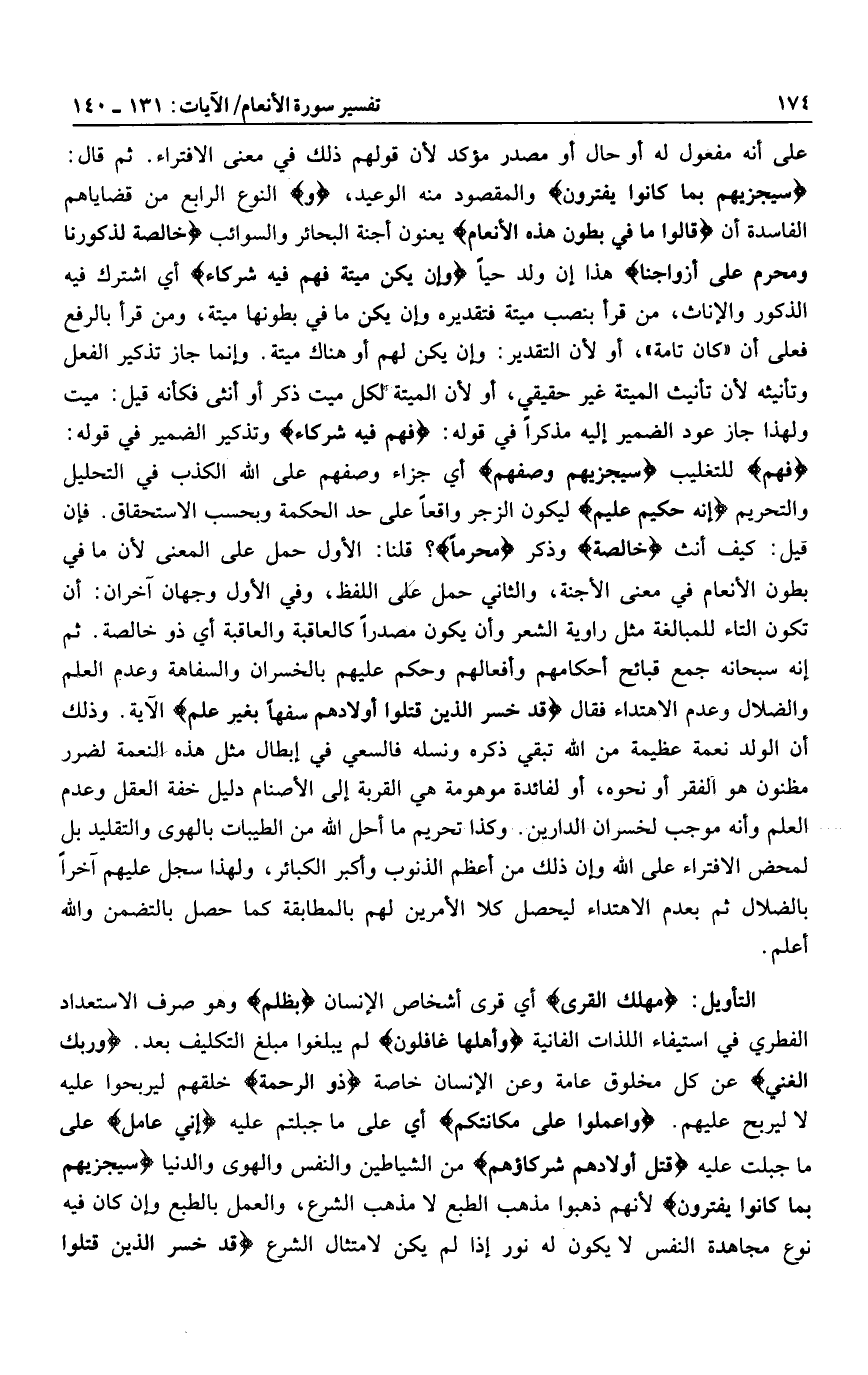 مُهْلِكَ الْقُرى أي قرى أشخاص الإنسان بِظُلْمٍ وهو صرف الاستعداد الفطري في استيفاء اللذات الفانية وَأَهْلُها غافِلُونَ لم يبلغوا مبلغ التكليف بعد. وَرَبُّكَ الْغَنِيُّ عن كل مخلوق عامة وعن الإنسان خاصة ذُو الرَّحْمَةِ خلقهم ليربحوا عليه لا ليربح عليهم. واعْمَلُوا عَلى مَكانَتِكُمْ أي على ما جبلتم عليه إِنِّي عامِلٌ على ما جبلت عليه قَتْلَ أَوْلادِهِمْ شُرَكاؤُهُمْ من الشياطين والنفس والهوى والدنيا سَيَجْزِيهِمْ بِما كانُوا يَفْتَرُونَ لأنهم ذهبوا مذهب الطبع لا مذهب الشرع، والعمل بالطبع وإن كان فيه نوع مجاهدة النفس لا يكون له نور إذا لم يكن لامتثال الشرع قَدْ خَسِرَ الَّذِينَ قَتَلُوا