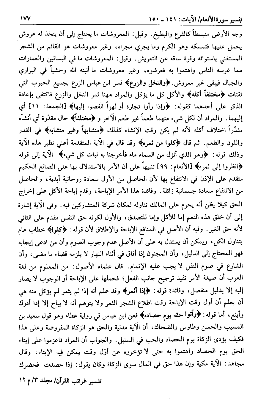 وجه الأرض منبسطا كالقرع والبطيخ. وقيل: المعروشات ما يحتاج إلى أن يتخذ له عروش يحمل عليها فتمسكه وهو الكرم وما يجري مجراه، وغير معروشات هو القائم من الشجر المستغني باستوائه وقوة ساقه عن التعريش. وقيل: المعروشات ما في البساتين والعمارات مما غرسه الناس واهتموا به فعرشوه، وغير معروشات ما أنبته الله وحشيا في البراري والجبال فيبقى غير معروش. وَالنَّخْلَ وَالزَّرْعَ فسر ابن عباس الزرع بجميع الحبوب التي تقتات مُخْتَلِفاً أُكُلُهُ والأكل كل ما يؤكل والمراد هاهنا ثمر النخل والزرع فاكتفى بإعادة الذكر على أحدهما كقوله: وَإِذا رَأَوْا تِجارَةً أَوْ لَهْواً انْفَضُّوا إِلَيْها [الجمعة: 11] أي إليهما. والمراد أن لكل شيء منهما طعما غير طعم الآخر ومُخْتَلِفاً حال مقدّرة أي أنشأه مقدّرا اختلاف أكله لأنه لم يكن وقت الإنشاء كذلك مُتَشابِهاً وَغَيْرَ مُتَشابِهٍ في القدر واللون والطعم. ثم قال كُلُوا مِنْ ثَمَرِهِ وقد قال في الآية المتقدمة أعني نظير هذه الآية وذلك قوله: وَهُوَ الَّذِي أَنْزَلَ مِنَ السَّماءِ ماءً فَأَخْرَجْنا بِهِ نَباتَ كُلِّ شَيْءٍ الآية إلى قوله انْظُرُوا إِلى ثَمَرِهِ [الأنعام: 99] تنبيها على أن الأمر بالاستدلال بها على الصانع الحكيم متقدم على الإذن في الانتفاع بها لأن الحاصل من الأول سعادة روحانية أبدية، والحاصل من الانتفاع سعادة جسمانية زائلة. وفائدة هذا الأمر الإباحة، وقدم إباحة الأكل على إخراج الحق كيلا يظن أنه يحرم على المالك تناوله لمكان شركة المتشاركين فيه. وفي الآية إشارة إلى أن خلق هذه النعم إما للأكل وإما للتصدق، والأول لكونه حق النفس مقدم على الثاني لأنه حق الغير. وفيه أن الأصل في المنافع الإباحة والإطلاق لأن قوله: كُلُوا خطاب عام يتناول الكل، ويمكن أن يستدل به على أن الأصل عدم وجوب الصوم وأن من ادعى إيجابه فهو المحتاج إلى الدليل، وأن المجنون إذا أفاق في أثناء النهار لا يلزمه قضاء ما مضى، وأن الشارع في صوم النفل لا يجب عليه الإتمام. قال علماء الأصول: من المعلوم من لغة العرب أن صيغة الأمر تفيد ترجيح جانب الفعل فحملها على الإباحة أو الوجوب لا يصار إليه إلا بدليل منفصل، وفائدة قوله: إِذا أَثْمَرَ وقد علم أنه إذا لم يثمر لم يؤكل منه هي أن يعلم أن أول وقت الإباحة وقت اطلاع الشجر الثمر ولا يتوهم أنه لا يباح إلا إذا أدرك وأينع، أما قوله: وَآتُوا حَقَّهُ يَوْمَ حَصادِهِ فعن ابن عباس في رواية عطاء وهو قول سعيد بن المسيب والحسن وطاوس والضحاك، أن الآية مدنية والحق هو الزكاة المفروضة وعلى هذا فكيف يؤدى الزكاة يوم الحصاد والحب في السنبل. والجواب أن المراد فاعزموا على إيتاء الحق يوم الحصاد واهتموا به حتى لا تؤخروه عن أوّل وقت يمكن فيه الإيتاء، وقال مجاهد: الآية مكية وإن هذا حق في المال سوى الزكاة وكان يقول: إذا حصدت فحضرك