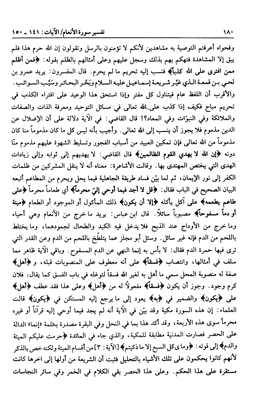 والأقرب أن اللفظ عام فيتناول كل مفتر وإذا استحق هذا الوعيد على افتراء الكذب في تحريم مباح فكيف إذا كذب على الله تعالى في مسائل التوحيد ومعرفة الذات والصفات والملائكة وفي النبوّات وفي المعاد؟! قال القاضي: في الآية دلالة على أن الإضلال عن الدين مذموم فلا يجوز أن ينسب إلى الله تعالى. وأجيب بأنه ليس كل ما كان مذموما منا كان مذموما من الله تعالى فإن تمكين العبيد من أسباب الفجور وتسليط الشهوة عليهم مذموم منّا دونه إِنَّ اللَّهَ لا يَهْدِي الْقَوْمَ الظَّالِمِينَ قال القاضي: لا يهديهم إلى ثوابه وإلى زيادات الهدى التي يختص المهتدى بها. وقالت الأشاعرة: معناه أنه لا ينقل المشركين من ظلمات الكفر إلى نور الإيمان، ثم لما بيّن فساد طريقة الجاهلية فيما يحل ويحرم من المطاعم أتبعه البيان الصحيح في الباب فقال: قُلْ لا أَجِدُ فِي ما أُوحِيَ إِلَيَّ مُحَرَّماً أي طعاما محرما عَلى طاعِمٍ يَطْعَمُهُ على آكل يأكله إِلَّا أَنْ يَكُونَ ذلك المأكول أو الموجود أو الطعام مَيْتَةً أَوْ دَماً مَسْفُوحاً مصبوبا سائلا. قال ابن عباس: يريد ما خرج من الأنعام وهي أحياء وما خرج من الأوداج عند الذبح فلا يدخل فيه الكبد والطحال لجمودهما، وما يختلط باللحم من الدم فإنه غير سائل. وسئل أبو مجلز عما يتلطّخ باللحم من الدم وعن القدر التي ترى فيها حمرة الدم فقال: لا بأس به إنما النهي عن الدم المسفوح. وباقي الآية ظاهر مما سلف في أمثالها، وانتصاب فِسْقاً على أنه معطوف على المنصوبات قبله، وأُهِلَّ صفة له منصوبة المحل سمي ما أهل به لغير الله فسقا لتوغله في باب الفسق كما يقال: فلان كرم وجود. وجوز أن يكون فِسْقاً مفعولا له من أُهِلَّ وعلى هذا فقد عطف أُهِلَّ على يَكُونَ والضمير في بِهِ يعود إلى ما يرجع إليه المستكن في يَكُونَ قالت العلماء: إن هذه السورة مكية وقد بيّن في الآية أنه لم يجد فيما أوحي إليه قرآنا أو غيره محرما سوى هذه الأربعة، وقد أكد هذا بما في النحل وفي البقرة مصدرة بكلمة «إنما» الدالة على الحصر فصارت المدنية مطابقة للمكية، والذي جاء في المائدة حُرِّمَتْ عَلَيْكُمُ الْمَيْتَةُ وَالدَّمُ إلى قوله: وَما أَكَلَ السَّبُعُ إِلَّا ما ذَكَّيْتُمْ [الآية: 3] من أقسام الميتة ولكنه خص بالذكر لأنهم كانوا يحكمون على تلك الأشياء بالتحليل فثبت أن الشريعة من أولها إلى آخرها كانت مستقرة على هذا الحكم. وعلى هذا الحصر بقي الكلام في الخمر وفي سائر النجاسات