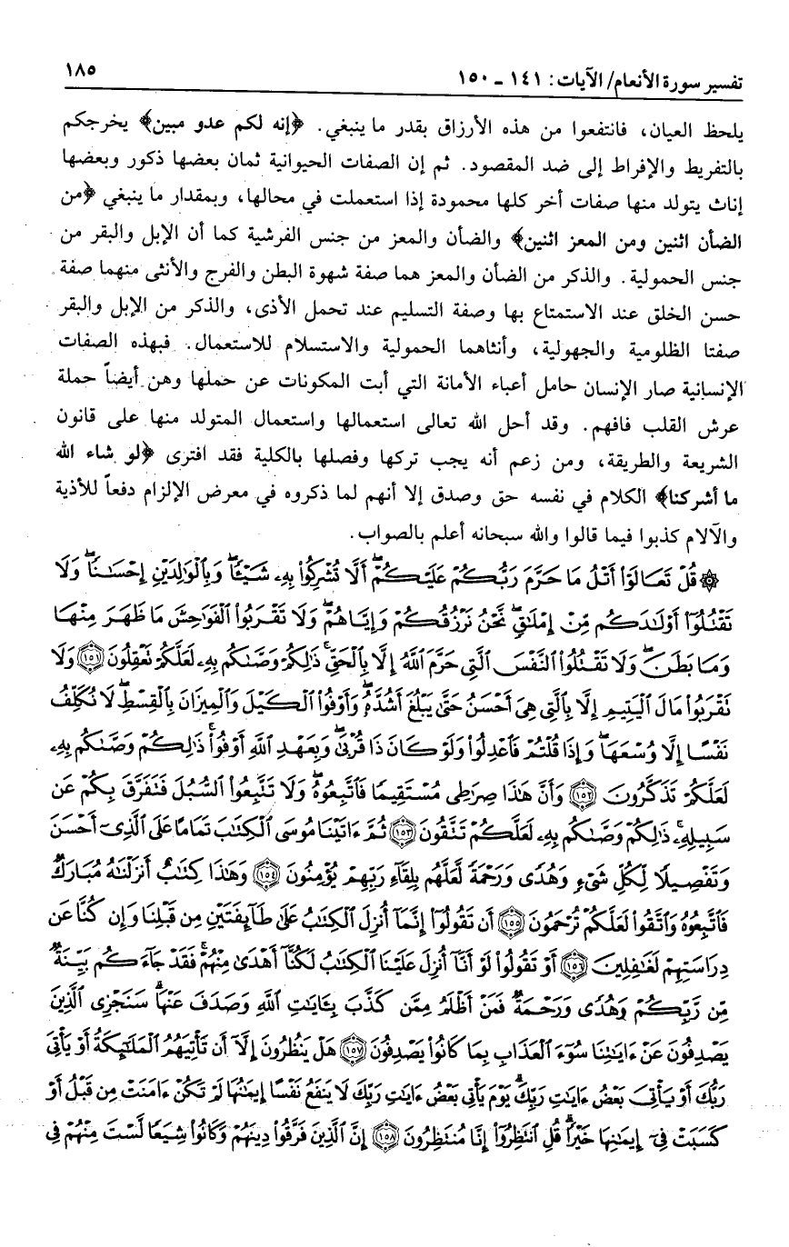 يلحظ العيان، فانتفعوا من هذه الأرزاق بقدر ما ينبغي. إِنَّهُ لَكُمْ عَدُوٌّ مُبِينٌ يخرجكم بالتفريط والإفراط إلى ضد المقصود. ثم إن الصفات الحيوانية ثمان بعضها ذكور وبعضها إناث يتولد منها صفات أخر كلها محمودة إذا استعملت في محالها، وبمقدار ما ينبغي مِنَ الضَّأْنِ اثْنَيْنِ وَمِنَ الْمَعْزِ اثْنَيْنِ والضأن والمعز من جنس الفرشية كما أن الإبل والبقر من جنس الحمولية. والذكر من الضأن والمعز هما صفة شهوة البطن والفرج والأنثى منهما صفة حسن الخلق عند الاستمتاع بها وصفة التسليم عند تحمل الأذى، والذكر من الإبل والبقر صفتا الظلومية والجهولية، وأنثاهما الحمولية والاستسلام للاستعمال. فبهذه الصفات الإنسانية صار الإنسان حامل أعباء الأمانة التي أبت المكونات عن حملها وهن أيضا حملة عرش القلب فافهم. وقد أحل الله تعالى استعمالها واستعمال المتولد منها على قانون الشريعة والطريقة، ومن زعم أنه يجب تركها وفصلها بالكلية فقد افترى لَوْ شاءَ اللَّهُ ما أَشْرَكْنا الكلام في نفسه حق وصدق إلا أنهم لما ذكروه في معرض الإلزام دفعا للأذية والآلام كذبوا فيما قالوا والله سبحانه أعلم بالصواب.