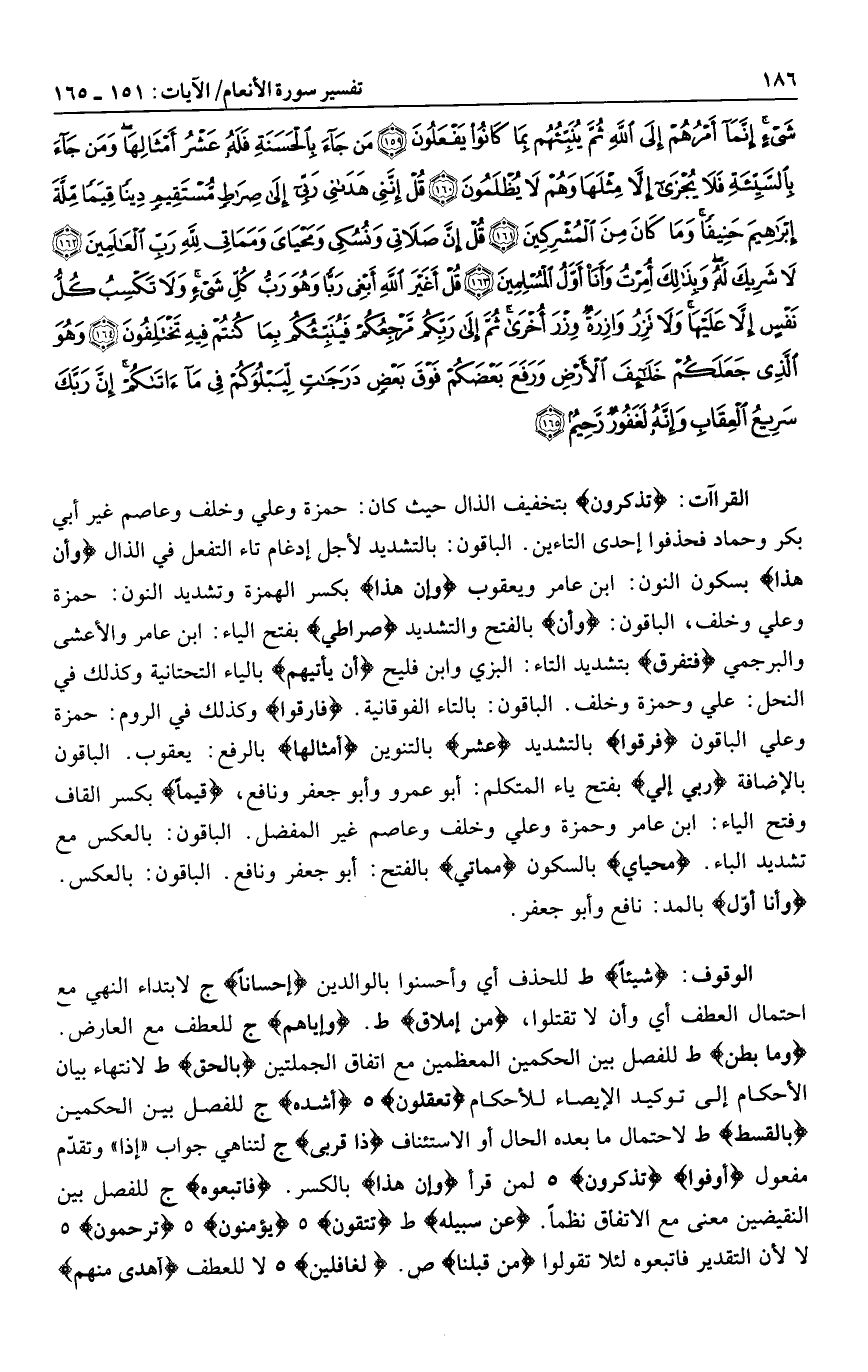 هـ لمن قرأ وَأَنَّ هذا بالكسر. فَاتَّبِعُوهُ ج للفصل بين النقيضين معنى مع الاتفاق نظما. عَنْ سَبِيلِهِ ط تَتَّقُونَ هـ يُؤْمِنُونَ هـ تُرْحَمُونَ هـ لا لأن التقدير فاتبعوه لئلا تقولوا مِنْ قَبْلِنا ص. لَغافِلِينَ هـ لا للعطف أَهْدى مِنْهُمْ