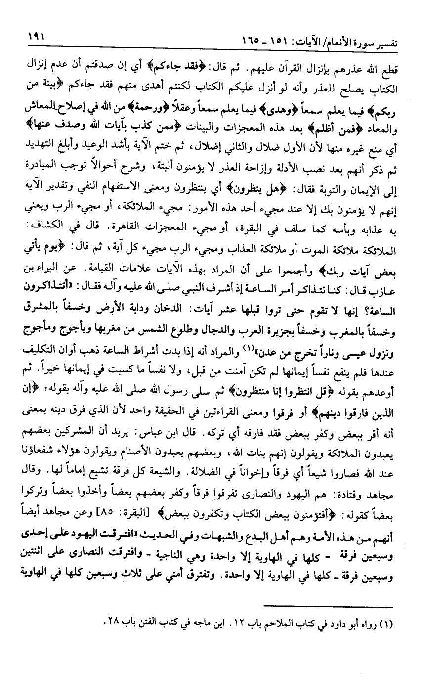 قطع الله عذرهم بإنزال القرآن عليهم. ثم قال: فَقَدْ جاءَكُمْ أي إن صدقتم أن عدم إنزال الكتاب يصلح للعذر وأنه لو أنزل عليكم الكتاب لكنتم أهدى منهم فقد جاءكم بَيِّنَةٌ مِنْ رَبِّكُمْ فيما يعلم سمعا وَهُدىً فيما يعلم سمعا وعقلا وَرَحْمَةٌ من الله في إصلاح المعاش والمعاد فَمَنْ أَظْلَمُ بعد هذه المعجزات والبينات مِمَّنْ كَذَّبَ بِآياتِ اللَّهِ وَصَدَفَ عَنْها أي منع غيره منها لأن الأول ضلال والثاني إضلال، ثم ختم الآية بأشد الوعيد وأبلغ التهديد ثم ذكر أنهم بعد نصب الأدلة وإزاحة العذر لا يؤمنون البتة، وشرح أحوالا توجب المبادرة إلى الإيمان والتوبة فقال: هَلْ يَنْظُرُونَ أي ينتظرون ومعنى الاستفهام النفي وتقدير الآية إنهم لا يؤمنون بك إلا عند مجيء أحد هذه الأمور: مجيء الملائكة، أو مجيء الرب ويعني به عذابه وبأسه كما سلف في البقرة، أو مجيء المعجزات القاهرة. قال في الكشاف: