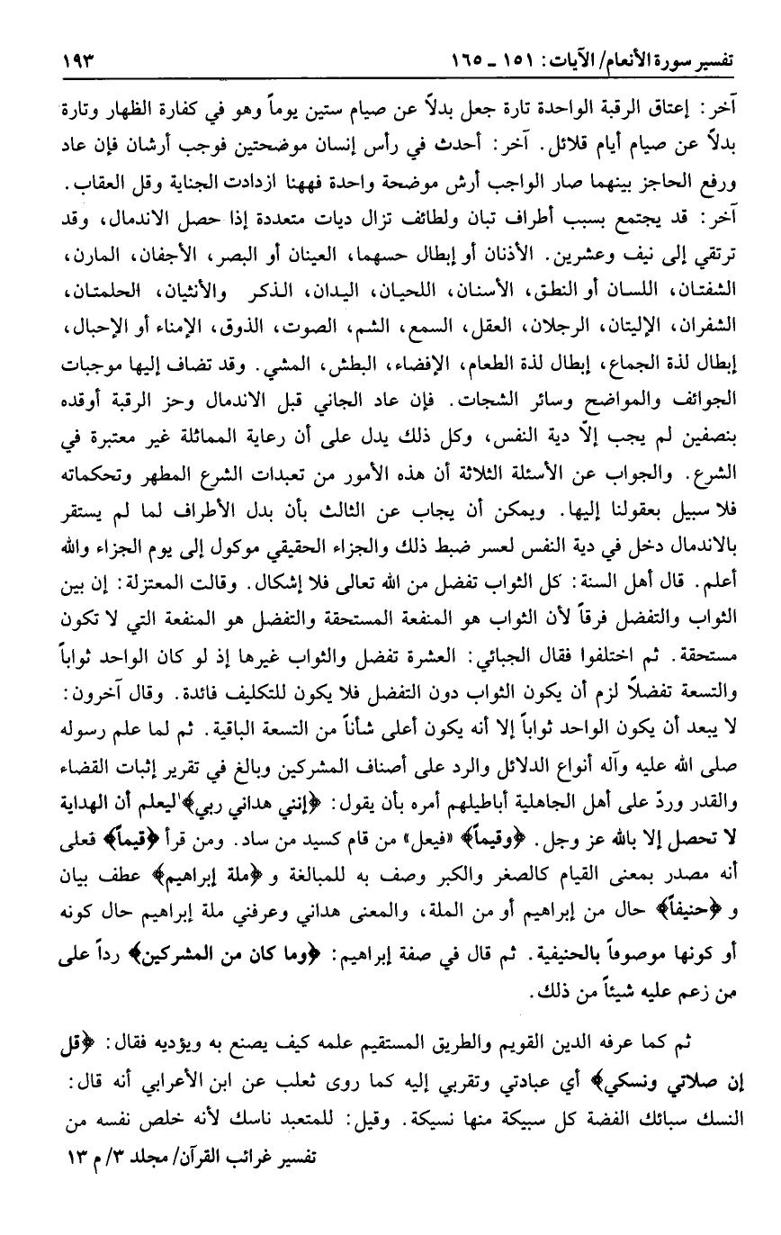 آخر: قد يجتمع بسبب أطراف تبان ولطائف تزال ديات متعددة إذا حصل الاندمال، وقد ترتقي إلى نيف وعشرين. الأذنان أو إبطال حسهما، العينان أو البصر، الأجفان، المارن، الشفتان، اللسان أو النطق، الأسنان، اللحيان، اليدان، الذكر والأنثيان، الحلمتان، الشفران، الإليتان، الرجلان، العقل، السمع، الشم، الصوت، الذوق، الإمناء أو الإحبال، إبطال لذة الجماع، إبطال لذة الطعام، الإفضاء، البطش، المشي. وقد تضاف إليها موجبات الجوائف والمواضح وسائر الشجات. فإن عاد الجاني قبل الاندمال وحز الرقبة أوقده بنصفين لم يجب إلّا دية النفس، وكل ذلك يدل على أن رعاية المماثلة غير معتبرة في الشرع. والجواب عن الأسئلة الثلاثة أن هذه الأمور من تعبدات الشرع المطهر وتحكماته فلا سبيل بعقولنا إليها. ويمكن أن يجاب عن الثالث بأن بدل الأطراف لما لم يستقر بالاندمال دخل في دية النفس لعسر ضبط ذلك والجزاء الحقيقي موكول إلى يوم الجزاء والله أعلم. قال أهل السنة: كل الثواب تفضل من الله تعالى فلا إشكال. وقالت المعتزلة: إن بين الثواب والتفضل فرقا لأن الثواب هو المنفعة المستحقة والتفضل هو المنفعة التي لا تكون مستحقة. ثم اختلفوا فقال الجبائي: العشرة تفضل والثواب غيرها إذ لو كان الواحد ثوابا والتسعة تفضلا لزم أن يكون الثواب دون التفضل فلا يكون للتكليف فائدة. وقال آخرون: