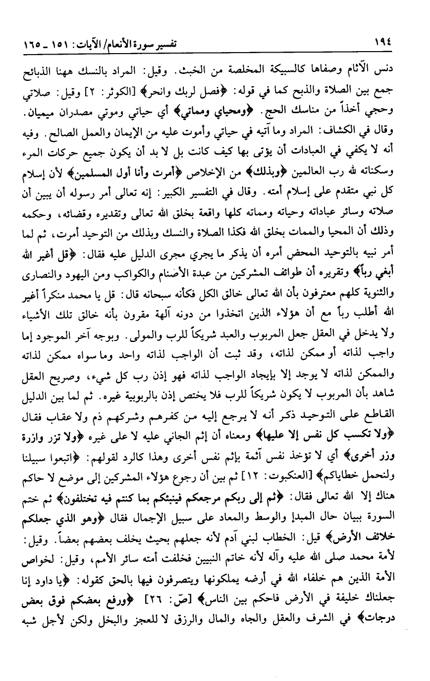 وقال في الكشاف: المراد وما آتيه في حياتي وأموت عليه من الإيمان والعمل الصالح. وفيه أنه لا يكفي في العبادات أن يؤتى بها كيف كانت بل لا بد أن يكون جميع حركات المرء وسكناته لله رب العالمين وَبِذلِكَ من الإخلاص أُمِرْتُ وَأَنَا أَوَّلُ الْمُسْلِمِينَ لأن إسلام كل نبي متقدم على إسلام أمته. وقال في التفسير الكبير: إنه تعالى أمر رسوله أن يبين أن صلاته وسائر عباداته وحياته ومماته كلها واقعة بخلق الله تعالى وتقديره وقضائه، وحكمه وذلك أن المحيا والممات بخلق الله فكذا الصلاة والنسك وبذلك من التوحيد أمرت، ثم لما أمر نبيه بالتوحيد المحض أمره أن يذكر ما يجري مجرى الدليل عليه فقال: قُلْ أَغَيْرَ اللَّهِ أَبْغِي رَبًّا وتقريره أن طوائف المشركين من عبدة الأصنام والكواكب ومن اليهود والنصارى والثنوية كلهم معترفون بأن الله تعالى خالق الكل فكأنه سبحانه قال: قل يا محمد منكرا أغير الله أطلب ربا مع أن هؤلاء الذين اتخذوا من دونه آلهة مقرون بأنه خالق تلك الأشياء ولا يدخل في العقل جعل المربوب والعبد شريكا للرب والمولى. وبوجه آخر الموجود إما واجب لذاته أو ممكن لذاته، وقد ثبت أن الواجب لذاته واحد وما سواه ممكن لذاته والممكن لذاته لا يوجد إلا بإيجاد الواجب لذاته فهو إذن رب كل شيء، وصريح العقل شاهد بأن المربوب لا يكون شريكا للرب فلا يختص إذن بالربوبية غيره. ثم لما بين الدليل القاطع على التوحيد ذكر أنه لا يرجع إليه من كفرهم وشركهم ذم ولا عقاب فقال وَلا تَكْسِبُ كُلُّ نَفْسٍ إِلَّا عَلَيْها ومعناه أن إثم الجاني عليه لا على غيره وَلا تَزِرُ وازِرَةٌ وِزْرَ أُخْرى أي لا تؤخذ نفس آثمة بإثم نفس أخرى وهذا كالرد لقولهم: اتَّبِعُوا سَبِيلَنا وَلْنَحْمِلْ خَطاياكُمْ [العنكبوت: 12] ثم بين أن رجوع هؤلاء المشركين إلى موضع لا حاكم هناك إلا الله تعالى فقال: ثُمَّ إِلى رَبِّكُمْ مَرْجِعُكُمْ فَيُنَبِّئُكُمْ بِما كُنْتُمْ فِيهِ تَخْتَلِفُونَ ثم ختم السورة ببيان حال المبدإ والوسط والمعاد على سبيل الإجمال فقال وَهُوَ الَّذِي جَعَلَكُمْ خَلائِفَ الْأَرْضِ قيل: الخطاب لبني آدم لأنه جعلهم بحيث يخلف بعضهم بعضا. وقيل: