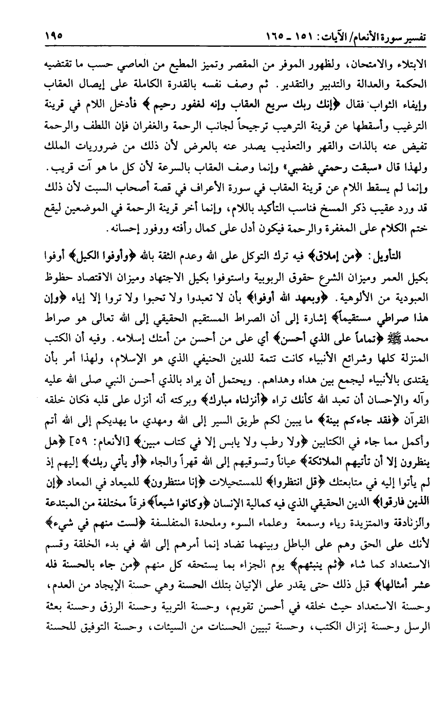 بأن لا تعبدوا ولا تحبوا ولا تروا إلا إياه وَأَنَّ هذا صِراطِي مُسْتَقِيماً إشارة إلى أن الصراط المستقيم الحقيقي إلى الله تعالى هو صراط محمد صلى الله عليه وسلم تَماماً عَلَى الَّذِي أَحْسَنَ أي على من أحسن من أمتك إسلامه. وفيه أن الكتب المنزلة كلها وشرائع الأنبياء كانت تتمة للدين الحنيفي الذي هو الإسلام، ولهذا أمر بأن يقتدى بالأنبياء ليجمع بين هداه وهداهم. ويحتمل أن يراد بالذي أحسن النبي صلى الله عليه وآله والإحسان أن تعبد الله كأنك تراه أَنْزَلْناهُ مُبارَكٌ وبركته أنه أنزل على قلبه فكان خلقه القرآن فَقَدْ جاءَكُمْ بَيِّنَةٌ ما يبين لكم طريق السير إلى الله ومهدي ما يهديكم إلى الله أتم وأكمل مما جاء في الكتابين وَلا رَطْبٍ وَلا يابِسٍ إِلَّا فِي كِتابٍ مُبِينٍ [الأنعام: 59] هَلْ يَنْظُرُونَ إِلَّا أَنْ تَأْتِيَهُمُ الْمَلائِكَةُ عيانا وتسوقيهم إلى الله قهرا والجاء أَوْ يَأْتِيَ رَبُّكَ إليهم إذ لم يأتوا إليه في متابعتك قُلِ انْتَظِرُوا للمستحيلات إِنَّا مُنْتَظِرُونَ للميعاد في المعاد إن الذين فارقوا الدين الحقيقي الذي فيه كمالية الإنسان وَكانُوا شِيَعاً فرقا مختلفة من المبتدعة والزنادقة والمتزيدة رياء وسمعة وعلماء السوء وملحدة المتفلسفة لَسْتَ مِنْهُمْ فِي شَيْءٍ لأنك على الحق وهم على الباطل وبينهما تضاد إنما أمرهم إلى الله في بدء الخلقة وقسم الاستعداد كما شاء ثُمَّ يُنَبِّئُهُمْ يوم الجزاء بما يستحقه كل منهم مَنْ جاءَ بِالْحَسَنَةِ فَلَهُ عَشْرُ أَمْثالِها قبل ذلك حتى يقدر على الإتيان بتلك الحسنة وهي حسنة الإيجاد من العدم، وحسنة الاستعداد حيث خلقه في أحسن تقويم، وحسنة التربية وحسنة الرزق وحسنة بعثة الرسل وحسنة إنزال الكتب، وحسنة تبيين الحسنات من السيئات، وحسنة التوفيق للحسنة