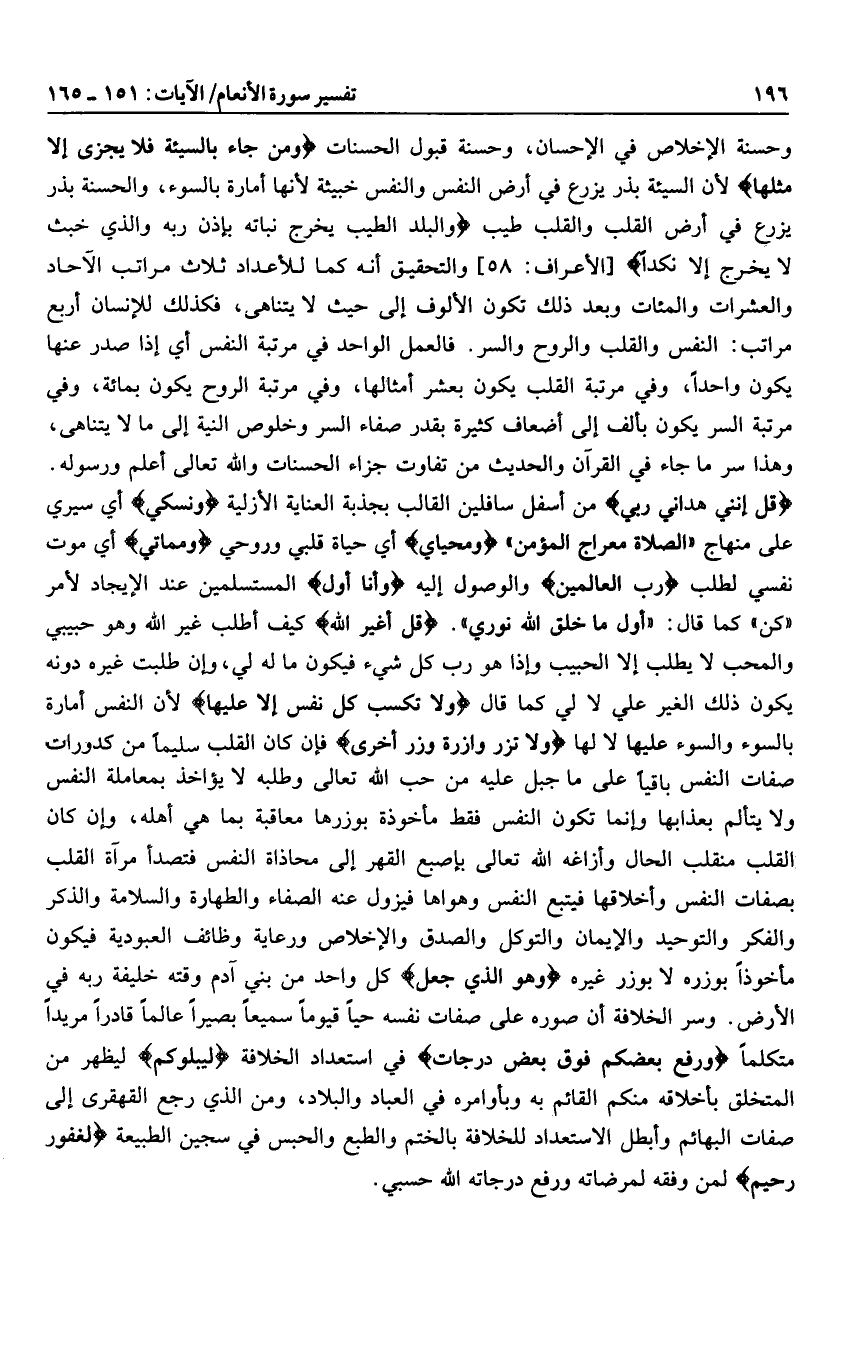 قُلْ إِنَّنِي هَدانِي رَبِّي من أسفل سافلين القالب بجذبة العناية الأزلية وَنُسُكِي أي سيري على منهاج «الصلاة معراج المؤمن» وَمَحْيايَ أي حياة قلبي وروحي وَمَماتِي أي موت نفسي لطلب رَبِّ الْعالَمِينَ والوصول إليه وَأَنَا أَوَّلُ المستسلمين عند الإيجاد لأمر «كن» كما قال: «أول ما خلق الله نوري» . قُلْ أَغَيْرَ اللَّهِ كيف أطلب غير الله وهو حبيبي والمحب لا يطلب إلا الحبيب وإذا هو رب كل شيء فيكون ما له لي، وإن طلبت غيره دونه يكون ذلك الغير علي لا لي كما قال وَلا تَكْسِبُ كُلُّ نَفْسٍ إِلَّا عَلَيْها لأن النفس أمارة بالسوء والسوء عليها لا لها وَلا تَزِرُ وازِرَةٌ وِزْرَ أُخْرى فإن كان القلب سليما من كدورات صفات النفس باقيا على ما جبل عليه من حب الله تعالى وطلبه لا يؤاخذ بمعاملة النفس ولا يتألم بعذابها وإنما تكون النفس فقط مأخوذة بوزرها معاقبة بما هي أهله، وإن كان القلب منقلب الحال وأزاغه الله تعالى بإصبع القهر إلى محاذاة النفس فتصدأ مرآة القلب بصفات النفس وأخلاقها فيتبع النفس وهواها فيزول عنه الصفاء والطهارة والسلامة والذكر والفكر والتوحيد والإيمان والتوكل والصدق والإخلاص ورعاية وظائف العبودية فيكون مأخوذا بوزره لا بوزر غيره وَهُوَ الَّذِي جَعَلَكُمْ كل واحد من بني آدم وقته خليفة ربه في الأرض. وسر الخلافة أن صوره على صفات نفسه حيا قيوما سميعا بصيرا عالما قادرا مريدا متكلما وَرَفَعَ بَعْضَكُمْ فَوْقَ بَعْضٍ دَرَجاتٍ في استعداد الخلافة لِيَبْلُوَكُمْ ليظهر من المتخلق بأخلاقه منكم القائم به وبأوامره في العباد والبلاد، ومن الذي رجع القهقرى إلى صفات البهائم وأبطل الاستعداد للخلافة بالختم والطبع والحبس في سجين الطبيعة لَغَفُورٌ رَحِيمٌ لمن وفقه لمرضاته ورفع درجاته الله حسبي.