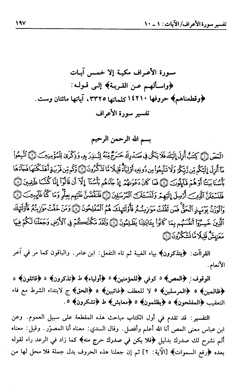المص هـ كوفي لِلْمُؤْمِنِينَ هـ أَوْلِياءَ ط تَذَكَّرُونَ هـ قائِلُونَ هـ ظالِمِينَ هـ الْمُرْسَلِينَ هـ لا للعطف غائِبِينَ هـ الْحَقُّ ج لابتداء الشرط مع فاء التعقيب الْمُفْلِحُونَ هـ يَظْلِمُونَ هـ مَعايِشَ ط تَشْكُرُونَ هـ.