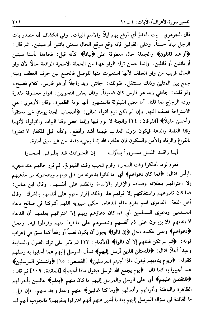 أَوْ هُمْ قائِلُونَ والجملة حال معطوفة على بَياتاً كأنه قيل: فجاءها بأسنا مبيتين أو بائتين أو قائلين. وإنما حسن ترك الواو هاهنا من الجملة الاسمية الواقعة حالا لأن واو الحال قريب من واو العطف لأنها استعيرت منها للوصل فالجمع بين حرف العطف وبينه جمع بين المثلين وذلك مستثقل. فقولك: جائني زيد راجلا أو هو فارس. كلام فصيح، ولو قلت: جاءني زيد هو فارس كان ضعيفا. وقال بعض النحويين: الواو محذوفة مقدرة ورده الزجاج لما قلنا. أما معنى القيلولة فالمشهور أنها نومة الظهيرة. وقال الأزهري: هي الاستراحة نصف النهار وإن لم يكن نوم لقوله تعالى: أَصْحابُ الْجَنَّةِ يَوْمَئِذٍ خَيْرٌ مُسْتَقَرًّا وَأَحْسَنُ مَقِيلًا [الفرقان: 24] والجنة لا نوم فيها وإنما خص وقتا البيات والقيلولة لأنهما وقتا الغفلة والدعة فيكون نزول العذاب فيهما أشد وأفظع. وكأنه قيل للكفار لا تغتروا بالفراغ والرفاه والأمن والسكون فإن عذاب الله إنما يجيء دفعة من غير سبق أمارة.