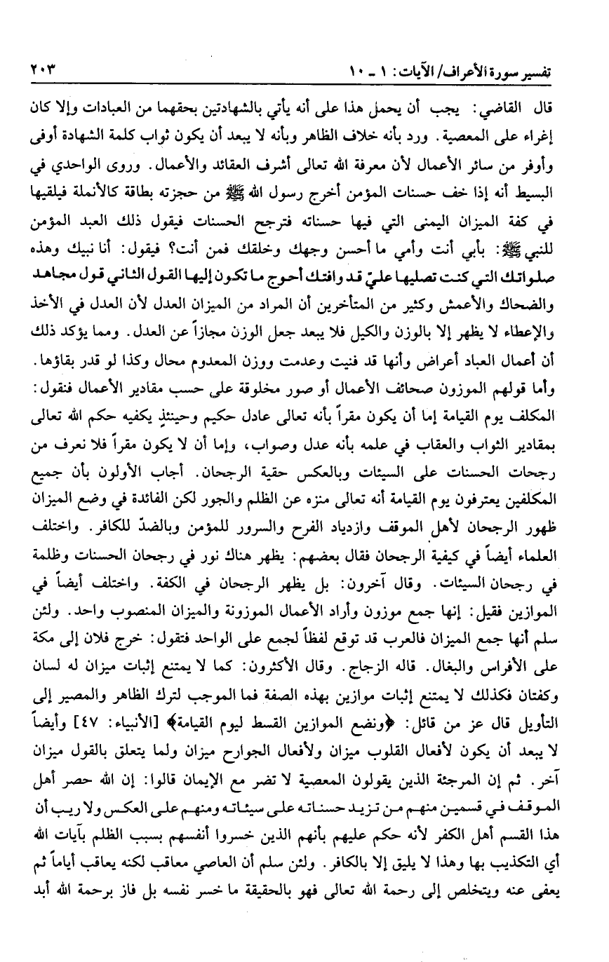 المكلف يوم القيامة إما أن يكون مقرا بأنه تعالى عادل حكيم وحينئذ يكفيه حكم الله تعالى بمقادير الثواب والعقاب في علمه بأنه عدل وصواب، وإما أن لا يكون مقرا فلا نعرف من رجحات الحسنات على السيئات وبالعكس حقية الرجحان. أجاب الأولون بأن جميع المكلفين يعترفون يوم القيامة أنه تعالى منزه عن الظلم والجور لكن الفائدة في وضع الميزان ظهور الرجحان لأهل الموقف وازدياد الفرح والسرور للمؤمن وبالضدّ للكافر. واختلف العلماء أيضا في كيفية الرجحان فقال بعضهم: يظهر هناك نور في رجحان الحسنات وظلمة في رجحان السيئات. وقال آخرون: بل يظهر الرجحان في الكفة. واختلف أيضا في الموازين فقيل: إنها جمع موزون وأراد الأعمال الموزونة والميزان المنصوب واحد. ولئن سلم أنها جمع الميزان فالعرب قد توقع لفظا لجمع على الواحد فتقول: خرج فلان إلى مكة على الأفراس والبغال. قاله الزجاج. وقال الأكثرون: كما لا يمتنع إثبات ميزان له لسان وكفتان فكذلك لا يمتنع إثبات موازين بهذه الصفة فما الموجب لترك الظاهر والمصير إلى التأويل قال عز من قائل: وَنَضَعُ الْمَوازِينَ الْقِسْطَ لِيَوْمِ الْقِيامَةِ [الأنبياء: 47] وأيضا لا يبعد أن يكون لأفعال القلوب ميزان ولأفعال الجوارح ميزان ولما يتعلق بالقول ميزان آخر. ثم إن المرجئة الذين يقولون المعصية لا تضر مع الإيمان قالوا: إن الله حصر أهل الموقف في قسمين منهم من تزيد حسناته على سيئاته ومنهم على العكس ولا ريب أن هذا القسم أهل الكفر لأنه حكم عليهم بأنهم الذين خسروا أنفسهم بسبب الظلم بآيات الله أي التكذيب بها وهذا لا يليق إلا بالكافر. ولئن سلم أن العاصي معاقب لكنه يعاقب أياما ثم يعفى عنه ويتخلص إلى رحمة الله تعالى فهو بالحقيقة ما خسر نفسه بل فاز برحمة الله أبد