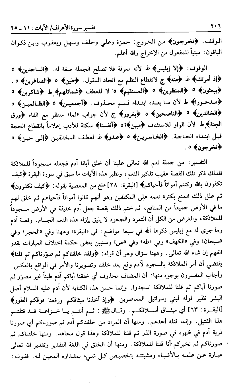 يُبْعَثُونَ هـ الْمُنْظَرِينَ هـ الْمُسْتَقِيمَ هـ لا للعطف شَمائِلِهِمْ ط شاكِرِينَ هـ مَدْحُوراً ط لأن ما بعده ابتداء قسم محذوف. أَجْمَعِينَ هـ الظَّالِمِينَ هـ الْخالِدِينَ هـ النَّاصِحِينَ هـ بِغُرُورٍ ج لأن جواب «لما» منتظر مع الفاء وَرَقِ الْجَنَّةِ ط لأن الواو للاستئناف مُبِينٌ هـ أَنْفُسَنا سكتة للأدب إعلاما بانقطاع الحجة قبل ابتداء الحاجة. الْخاسِرِينَ هـ عَدُوٌّ ط لعطف المختلفين إِلى حِينٍ هـ تُخْرَجُونَ هـ.