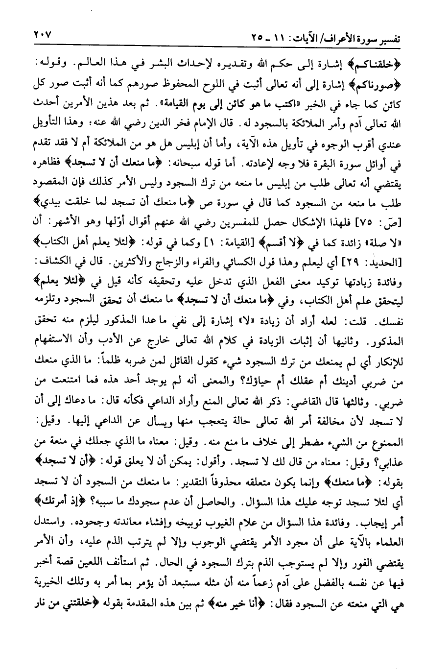 ثم بعد هذين الأمرين أحدث الله تعالى آدم وأمر الملائكة بالسجود له. قال الإمام فخر الدين رضي الله عنه: وهذا التأويل عندي أقرب الوجوه في تأويل هذه الآية، وأما أن إبليس هل هو من الملائكة أم لا فقد تقدم في أوائل سورة البقرة فلا وجه لإعادته. أما قوله سبحانه: ما مَنَعَكَ أَلَّا تَسْجُدَ فظاهره يقتضي أنه تعالى طلب من إبليس ما منعه من ترك السجود وليس الأمر كذلك فإن المقصود طلب ما منعه من السجود كما قال في سورة ص ما مَنَعَكَ أَنْ تَسْجُدَ لِما خَلَقْتُ بِيَدَيَّ [ص: 75] فلهذا الإشكال حصل للمفسرين رضي الله عنهم أقوال أوّلها وهو الأشهر: أن «لا صلة» زائدة كما في لا أُقْسِمُ [القيامة: 1] وكما في قوله: لِئَلَّا يَعْلَمَ أَهْلُ الْكِتابِ [الحديد: 29] أي ليعلم وهذا قول الكسائي والفراء والزجاج والأكثرين. قال في الكشاف: