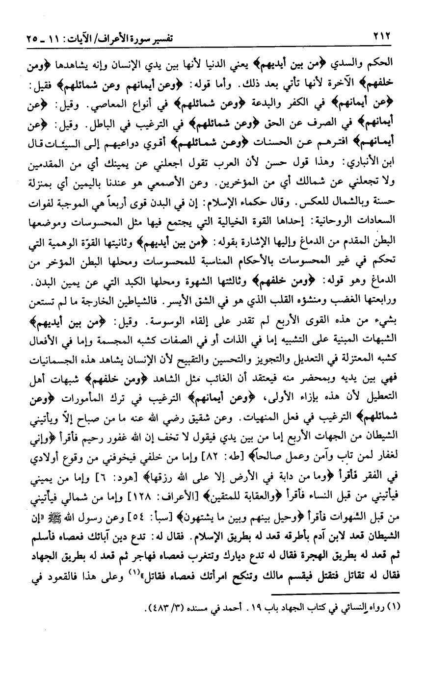ورابعتها الغضب ومنشؤه القلب الذي هو في الشق الأيسر. فالشياطين الخارجة ما لم تستعن بشيء من هذه القوى الأربع لم تقدر على إلقاء الوسوسة. وقيل: مِنْ بَيْنِ أَيْدِيهِمْ الشبهات المبنية على التشبيه إما في الذات أو في الصفات كشبه المجسمة وإما في الأفعال كشبه المعتزلة في التعديل والتجويز والتحسين والتقبيح لأن الإنسان يشاهد هذه الجسمانيات فهي بين يديه وبمحضر منه فيعتقد أن الغائب مثل الشاهد وَمِنْ خَلْفِهِمْ شبهات أهل التعطيل لأن هذه بإزاء الأولى، وَعَنْ أَيْمانِهِمْ الترغيب في ترك المأمورات وَعَنْ شَمائِلِهِمْ الترغيب في فعل المنهيات. وعن شقيق رضي الله عنه ما من صباح إلّا ويأتيني الشيطان من الجهات الأربع إما من بين يدي فيقول لا تخف إن الله غفور رحيم فأقرأ وَإِنِّي لَغَفَّارٌ لِمَنْ تابَ وَآمَنَ وَعَمِلَ صالِحاً [طه: 82] وإما من خلفي فيخوفني من وقوع أولادي في الفقر فأقرأ وَما مِنْ دَابَّةٍ فِي الْأَرْضِ إِلَّا عَلَى اللَّهِ رِزْقُها [هود: 6] وإما من يميني فيأتيني من قبل النساء فأقرأ وَالْعاقِبَةُ لِلْمُتَّقِينَ [الأعراف: 128] وإما من شمالي فيأتيني من قبل الشهوات فأقرأ وَحِيلَ بَيْنَهُمْ وَبَيْنَ ما يَشْتَهُونَ [سبأ: 54]