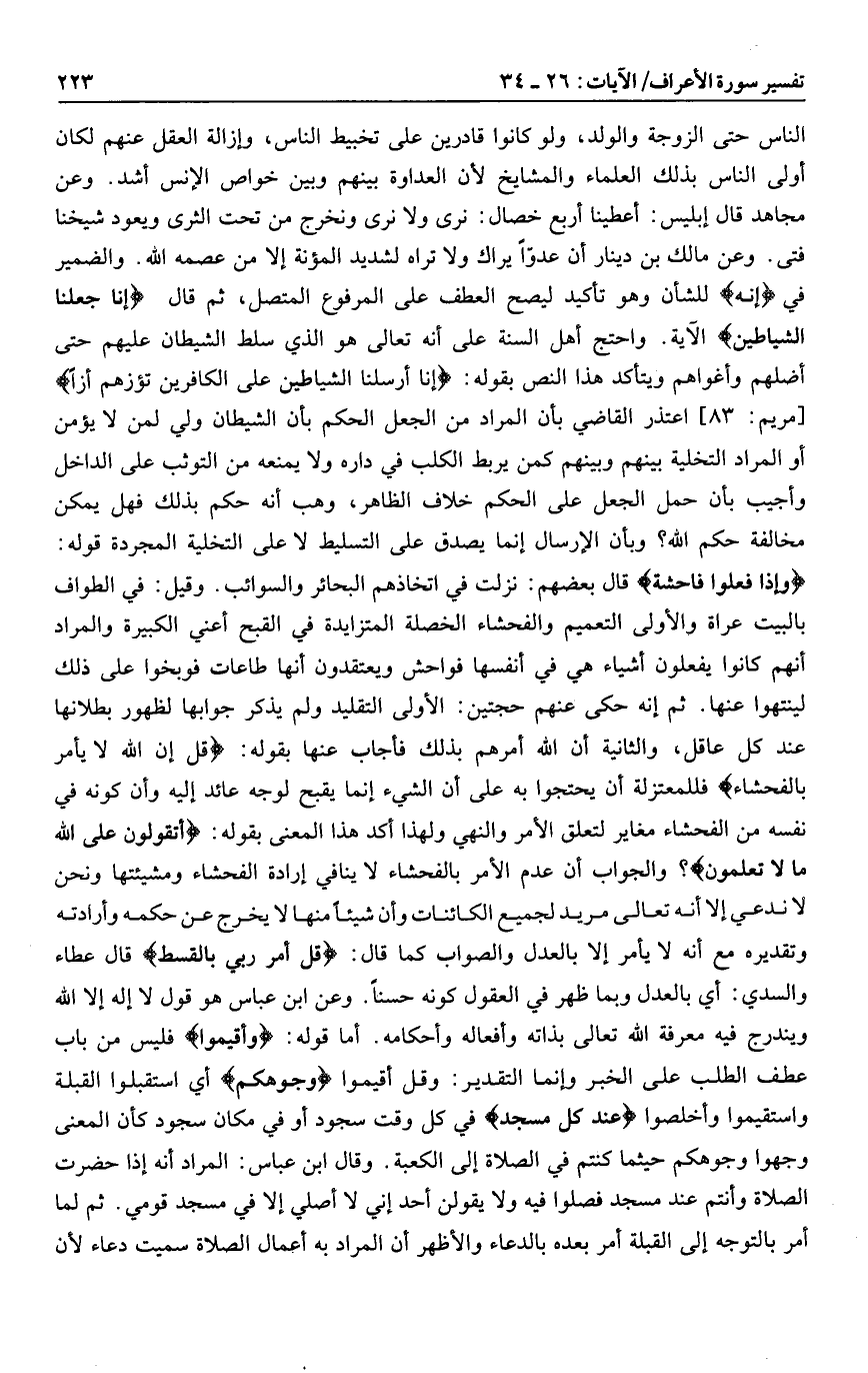 وَإِذا فَعَلُوا فاحِشَةً قال بعضهم: نزلت في اتخاذهم البحائر والسوائب. وقيل: في الطواف بالبيت عراة والأولى التعميم والفحشاء الخصلة المتزايدة في القبح أعني الكبيرة والمراد أنهم كانوا يفعلون أشياء هي في أنفسها فواحش ويعتقدون أنها طاعات فوبخوا على ذلك لينتهوا عنها. ثم إنه حكى عنهم حجتين: الأولى التقليد ولم يذكر جوابها لظهور بطلانها عند كل عاقل، والثانية أن الله أمرهم بذلك فأجاب عنها بقوله: قُلْ إِنَّ اللَّهَ لا يَأْمُرُ بِالْفَحْشاءِ فللمعتزلة أن يحتجوا به على أن الشيء إنما يقبح لوجه عائد إليه وأن كونه في نفسه من الفحشاء مغاير لتعلق الأمر والنهي ولهذا أكد هذا المعنى بقوله: أَتَقُولُونَ عَلَى اللَّهِ ما لا تَعْلَمُونَ؟ والجواب أن عدم الأمر بالفحشاء لا ينافي إرادة الفحشاء ومشيئتها ونحن لا ندعي إلا أنه تعالى مريد لجميع الكائنات وأن شيئا منها لا يخرج عن حكمه وأرادته وتقديره مع أنه لا يأمر إلا بالعدل والصواب كما قال: قُلْ أَمَرَ رَبِّي بِالْقِسْطِ قال عطاء والسدي: أي بالعدل وبما ظهر في العقول كونه حسنا. وعن ابن عباس هو قول لا إله إلا الله ويندرج فيه معرفة الله تعالى بذاته وأفعاله وأحكامه. أما قوله: وَأَقِيمُوا فليس من باب عطف الطلب على الخبر وإنما التقدير: وقل أقيموا وُجُوهَكُمْ أي استقبلوا القبلة واستقيموا وأخلصوا عِنْدَ كُلِّ مَسْجِدٍ في كل وقت سجود أو في مكان سجود كأن المعنى وجهوا وجوهكم حيثما كنتم في الصلاة إلى الكعبة. وقال ابن عباس: المراد أنه إذا حضرت الصلاة وأنتم عند مسجد فصلوا فيه ولا يقولن أحد إني لا أصلي إلا في مسجد قومي. ثم لما أمر بالتوجه إلى القبلة أمر بعده بالدعاء والأظهر أن المراد به أعمال الصلاة سميت دعاء لأن