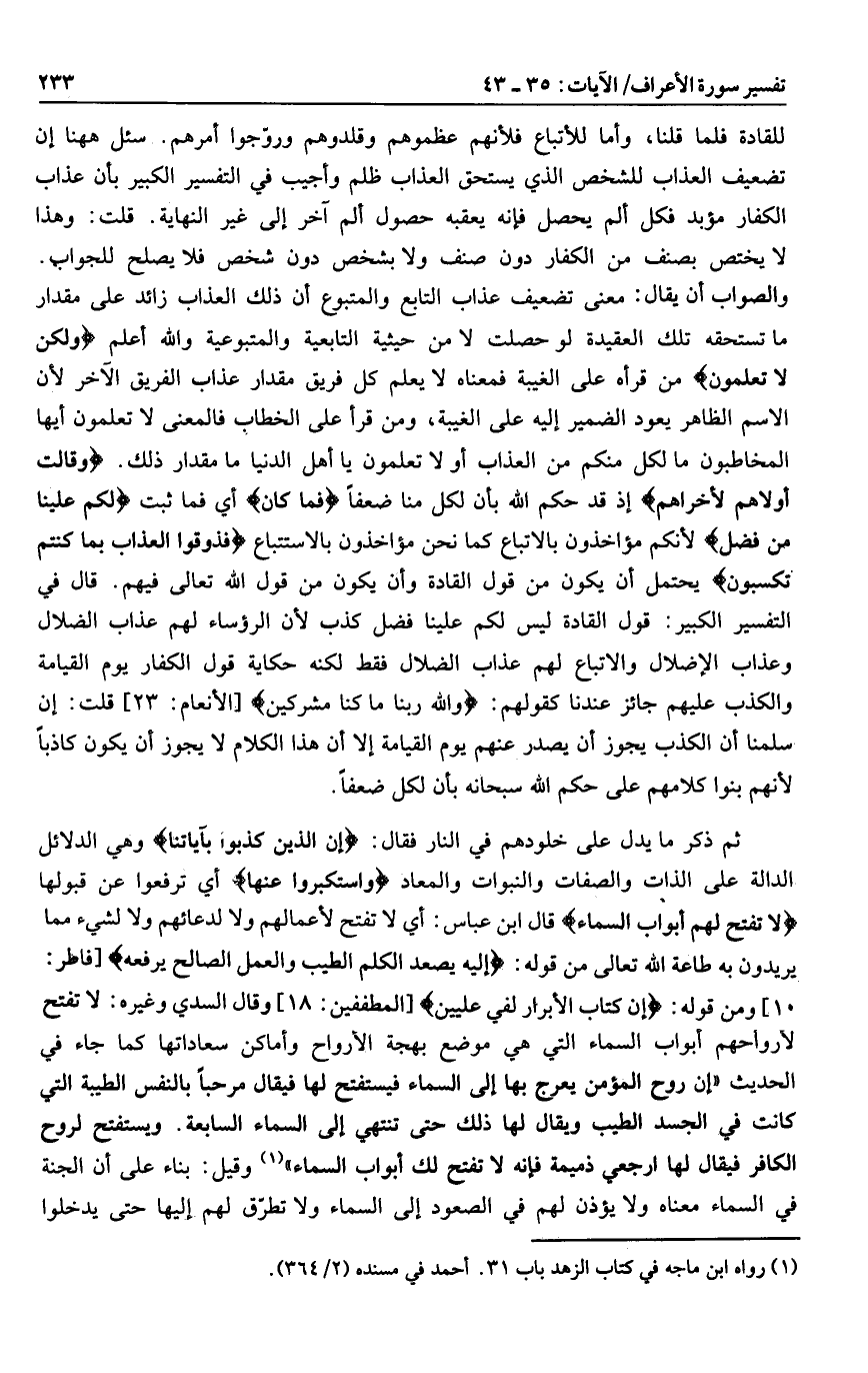 10] ومن قوله: إِنَّ كِتابَ الْأَبْرارِ لَفِي عِلِّيِّينَ [المطففين: 18] وقال السدي وغيره: لا تفتح لأرواحهم أبواب السماء التي هي موضع بهجة الأرواح وأماكن سعاداتها كما