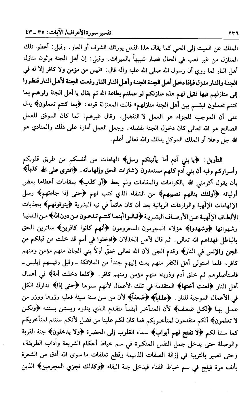 يا بَنِي آدَمَ إِمَّا يَأْتِيَنَّكُمْ رُسُلٌ الهامات من أنفسكم من طريق قلوبكم وأسراركم وفيه أن بني آدم كلهم مستعدون لإشارات الحق وإلهاماته. افْتَرى عَلَى اللَّهِ كَذِباً بأن يقول أكرمني الله بالكرامات والمقامات ولم يعط أَوْ كَذَّبَ بمقامات أعطاها بعض أوليائه أُولئِكَ يَنالُهُمْ نَصِيبُهُمْ من الشقاء الذي كتب لهم حَتَّى إِذا جاءَتْهُمْ رسل الإلهامات الإلهية والواردات الربانية بعد أن كان هائما في تيه البشرية يَتَوَفَّوْنَهُمْ بجذبات الألطاف الإلهية عن الأوصاف البشرية قالُوا أَيْنَ ما كُنْتُمْ تَدْعُونَ مِنْ دُونِ اللَّهِ من الدنيا وشهواتها وَشَهِدُوا هؤلاء المجرمون المحرومون أَنَّهُمْ كانُوا كافِرِينَ ساترين الحق بالباطل فهداهم الله تعالى. ثم قال لأهل الخذلان ادْخُلُوا فِي أُمَمٍ قَدْ خَلَتْ مِنْ قَبْلِكُمْ مِنَ الْجِنِّ وَالْإِنْسِ فِي النَّارِ وقدم الجن لأن الله تعالى خلق أولا بني الجان منهم مؤمن ومنهم كافر، فلما استولى أهل الكفر منهم بعث إليهم جندا من الملائكة- وقيل رئيسهم إبليس- فاستأصلوهم ثم خلق آدم وذريته منهم مؤمن ومنهم كافر. كُلَّما دَخَلَتْ أُمَّةٌ في أعمال أهل النار لَعَنَتْ أُخْتَها المتقدمة في تلك الأعمال لأنهم سنوها حَتَّى إِذَا تدارك الكل في الأعمال الموجبة للنار. عَذاباً ضِعْفاً لأن من سن سنة سيئة فعليه وزرها ووزر من عمل بها لِكُلٍّ ضِعْفٌ لأن المتأخر أيضا متقدم الذي يتلوه ويستن بسنته وَلكِنْ لا تَعْلَمُونَ أنكم متقدمون لمتأخريكم فما كان لكم علينا من فضل لأنكم سننتم لمتأخريكم كما سننا لكم لا تُفَتَّحُ لَهُمْ أَبْوابُ سماء القلوب إلى الحضرة وَلا يَدْخُلُونَ جنة القربة والوصلة حتى يدخل جمل النفس المتكبرة في سم خياط أحكام الشريعة وآداب الطريقة، وحتى تصير بالتربية في إزالة الصفات الذميمة وقطع تعلقات ما سوى الله أدق من الشعرة بألف مرة فيلج في سم خياط الفناء فيدخل جنة البقاء وَكَذلِكَ نَجْزِي الْمُجْرِمِينَ الذين