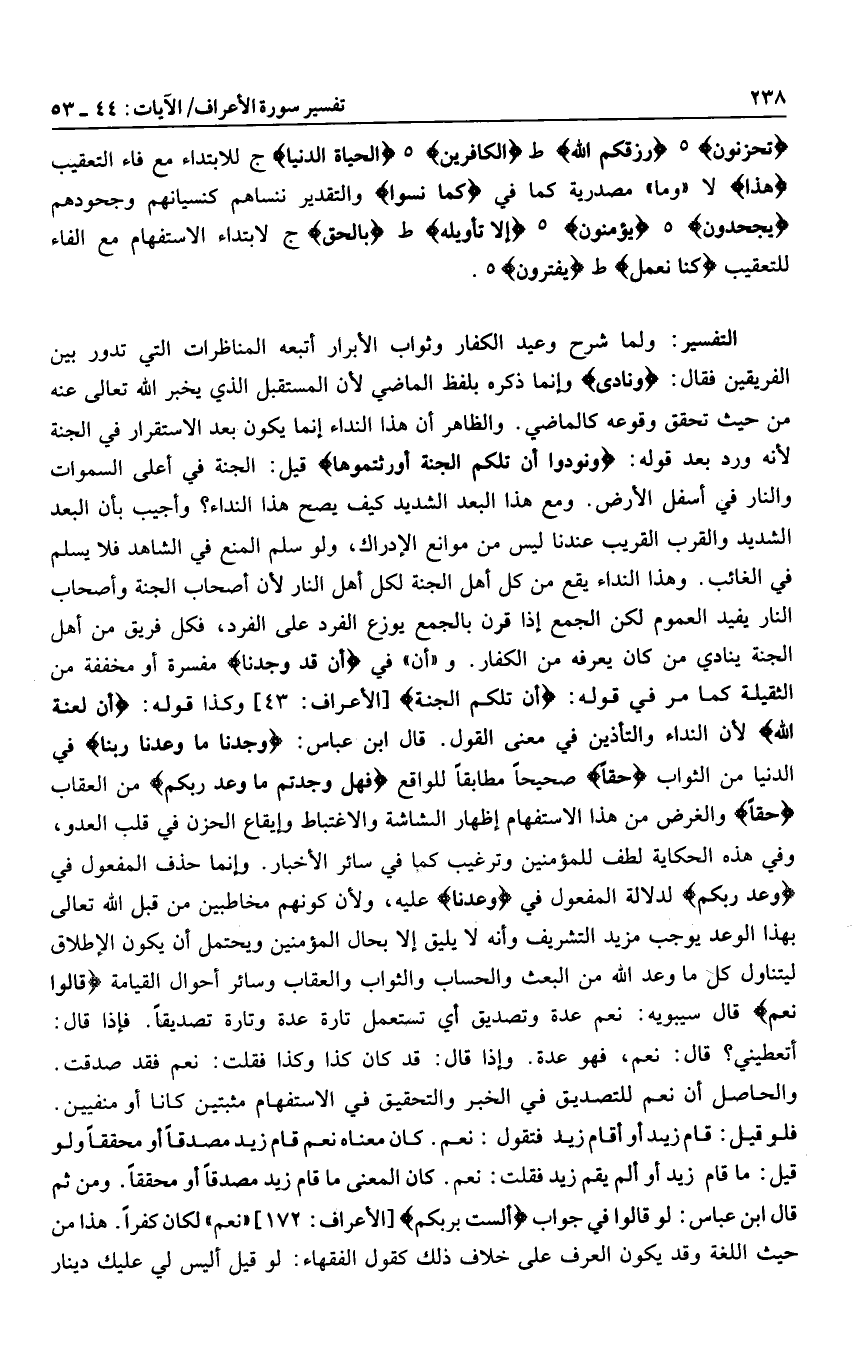 ولما شرح وعيد الكفار وثواب الأبرار أتبعه المناظرات التي تدور بين الفريقين فقال: وَنادى وإنما ذكره بلفظ الماضي لأن المستقبل الذي يخبر الله تعالى عنه من حيث تحقق وقوعه كالماضي. والظاهر أن هذا النداء إنما يكون بعد الاستقرار في الجنة لأنه ورد بعد قوله: وَنُودُوا أَنْ تِلْكُمُ الْجَنَّةُ أُورِثْتُمُوها قيل: الجنة في أعلى السموات والنار في أسفل الأرض. ومع هذا البعد الشديد كيف يصح هذا النداء؟ وأجيب بأن البعد الشديد والقرب القريب عندنا ليس من موانع الإدراك، ولو سلم المنع في الشاهد فلا يسلم في الغائب. وهذا النداء يقع من كل أهل الجنة لكل أهل النار لأن أصحاب الجنة وأصحاب النار يفيد العموم لكن الجمع إذا قرن بالجمع يوزع الفرد على الفرد، فكل فريق من أهل الجنة ينادي من كان يعرفه من الكفار. و «أن» في أَنْ قَدْ وَجَدْنا مفسرة أو مخففة من الثقيلة كما مر في قوله: أَنْ تِلْكُمُ الْجَنَّةُ [الأعراف: 43] وكذا قوله: أَنْ لَعْنَةُ اللَّهِ لأن النداء والتأذين في معنى القول. قال ابن عباس: وَجَدْنا ما وَعَدَنا رَبُّنا في الدنيا من الثواب حَقًّا صحيحا مطابقا للواقع فَهَلْ وَجَدْتُمْ ما وَعَدَ رَبُّكُمْ من العقاب حَقًّا والغرض من هذا الاستفهام إظهار الشاشة والاغتباط وإيقاع الحزن في قلب العدو، وفي هذه الحكاية لطف للمؤمنين وترغيب كما في سائر الأخبار. وإنما حذف المفعول في وَعَدَ رَبُّكُمْ لدلالة المفعول في وَعَدَنا عليه، ولأن كونهم مخاطبين من قبل الله تعالى بهذا الوعد يوجب مزيد التشريف وأنه لا يليق إلا بحال المؤمنين ويحتمل أن يكون الإطلاق ليتناول كل ما وعد الله من البعث والحساب والثواب والعقاب وسائر أحوال القيامة قالُوا نَعَمْ قال سيبويه: نعم عدة وتصديق أي تستعمل تارة عدة وتارة تصديقا. فإذا قال: