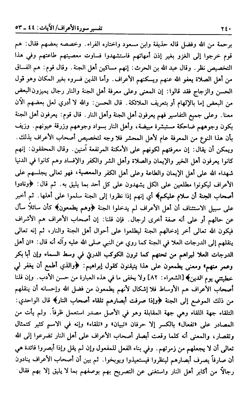 ومعنى يطمعون على هذا يتيقنون كقول إبراهيم: وَالَّذِي أَطْمَعُ أَنْ يَغْفِرَ لِي خَطِيئَتِي يَوْمَ الدِّينِ [الشعراء: 82] ولا يخفى ما في هذه العبارة من حسن الأدب. وإن قلنا أصحاب الأعراف هم الأوساط فلا إشكال لأنهم يطمعون من فضل الله وإحسانه أن ينقلهم من ذلك الموضع إلى الجنة وَإِذا صُرِفَتْ أَبْصارُهُمْ تِلْقاءَ أَصْحابِ النَّارِ قال الواحدي: