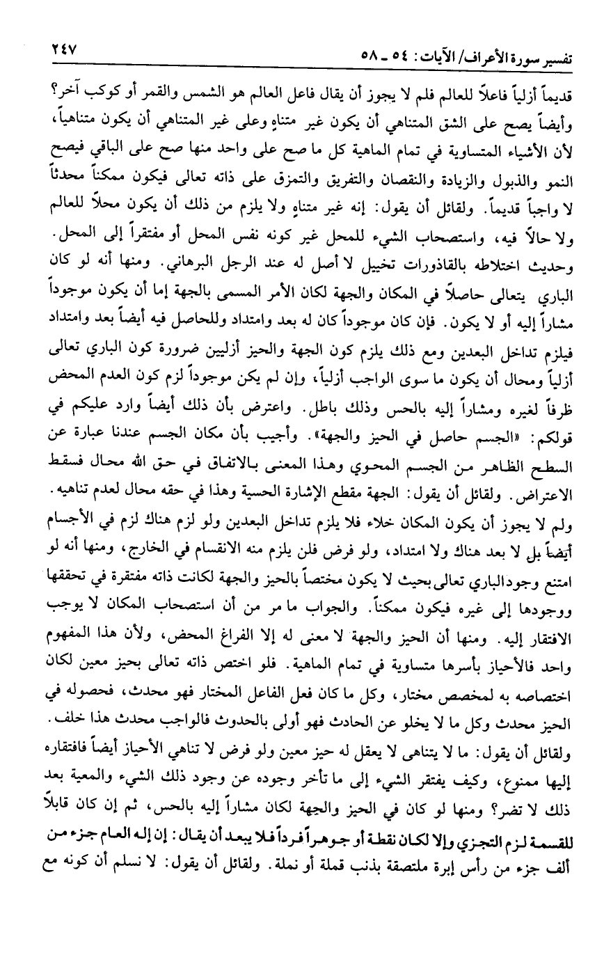 وحديث اختلاطه بالقاذورات تخييل لا أصل له عند الرجل البرهاني. ومنها أنه لو كان الباري يتعالى حاصلا في المكان والجهة لكان الأمر المسمى بالجهة إما أن يكون موجودا مشارا إليه أو لا يكون. فإن كان موجودا كان له بعد وامتداد وللحاصل فيه أيضا بعد وامتداد فيلزم تداخل البعدين ومع ذلك يلزم كون الجهة والحيز أزليين ضرورة كون الباري تعالى أزليا ومحال أن يكون ما سوى الواجب أزليا، وإن لم يكن موجودا لزم كون العدم المحض ظرفا لغيره ومشارا إليه بالحس وذلك باطل. واعترض بأن ذلك أيضا وارد عليكم في قولكم: «الجسم حاصل في الحيز والجهة» . وأجيب بأن مكان الجسم عندنا عبارة عن السطح الظاهر من الجسم المحوي وهذا المعنى بالاتفاق في حق الله محال فسقط الاعتراض. ولقائل أن يقول: الجهة مقطع الإشارة الحسية وهذا في حقه محال لعدم تناهيه.