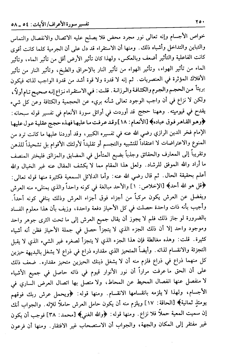 خواص الأجسام وإنه تعالى نور مجرد محض فلا يصلح عليه الاتصال والانفصال والتماس والتباين والتداخل وأشباه ذلك. ومنها أن الاستقراء قد دل على أن الجرمية كلما كانت أقوى كانت الفاعلية والتأثير أضعف وبالعكس، ولهذا كان تأثير الأرض أقل من تأثير الماء، وتأثير الماء من تأثير الهواء، وتأثير الهواء من تأثير النار بالإحراق والطبخ، وتأثير النار من تأثير الأفلاك المؤثرة في العنصريات. ثم إنه لا قدرة ولا قوة أشد من قدرة الواجب لذاته فيكون بريئا من الحجم والجرم والكثافة والرزانة. قلت: في الاستقراء نزاع إنه صحيح تام أولا، ولكن لا نزاع في أن واجب الوجود تعالى شأنه بريء عن الحجمية والكثافة وعن كل شيء يقدح في قيوميته. وهاهنا حجج قد أوردت في أوائل سورة الأنعام في تفسير قوله سبحانه: