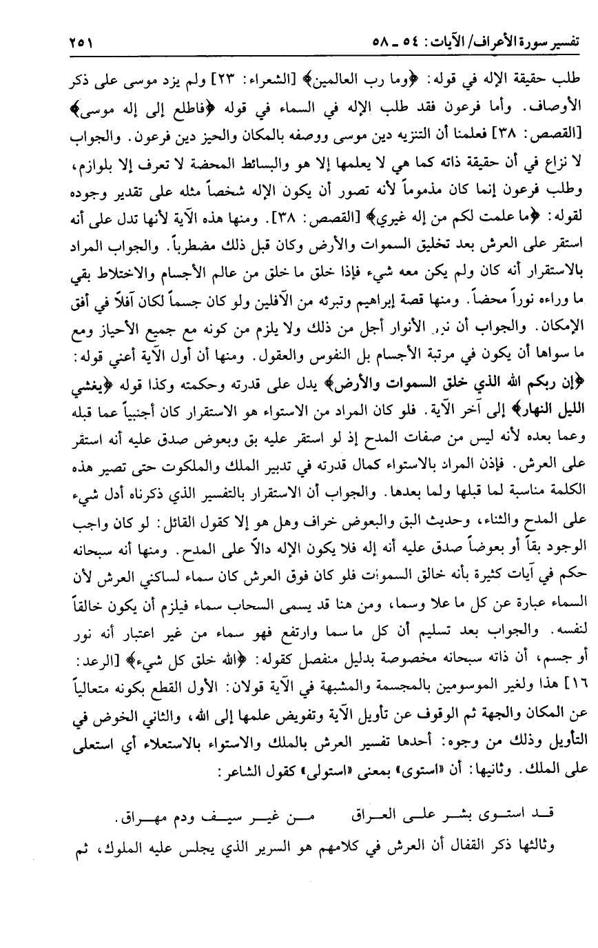 إِنَّ رَبَّكُمُ اللَّهُ الَّذِي خَلَقَ السَّماواتِ وَالْأَرْضَ يدل على قدرته وحكمته وكذا قوله يُغْشِي اللَّيْلَ النَّهارَ إلى آخر الآية. فلو كان المراد من الاستواء هو الاستقرار كان أجنبيا عما قبله وعما بعده لأنه ليس من صفات المدح إذ لو استقر عليه بق وبعوض صدق عليه أنه استقر على العرش. فإذن المراد بالاستواء كمال قدرته في تدبير الملك والملكوت حتى تصير هذه الكلمة مناسبة لما قبلها ولما بعدها. والجواب أن الاستقرار بالتفسير الذي ذكرناه أدل شيء على المدح والثناء، وحديث البق والبعوض خراف وهل هو إلا كقول القائل: لو كان واجب الوجود بقا أو بعوضا صدق عليه أنه إله فلا يكون الإله دالا على المدح. ومنها أنه سبحانه حكم في آيات كثيرة بأنه خالق السموات فلو كان فوق العرش كان سماء لساكني العرش لأن السماء عبارة عن كل ما علا وسما، ومن هنا قد يسمى السحاب سماء فيلزم أن يكون خالقا لنفسه. والجواب بعد تسليم أن كل ما سما وارتفع فهو سماء من غير اعتبار أنه نور أو جسم، أن ذاته سبحانه مخصوصة بدليل منفصل كقوله: اللَّهُ خالِقُ كُلِّ شَيْءٍ [الرعد: