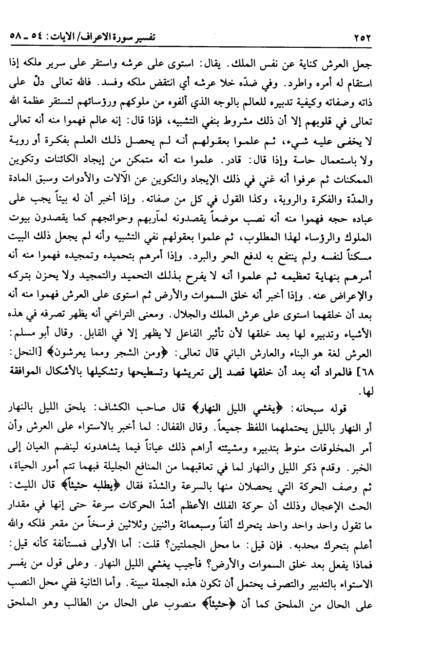 جعل العرش كناية عن نفس الملك. يقال: استوى على عرشه واستقر على سرير ملكه إذا استقام له أمره واطرد. وفي ضدّه خلا عرشه أي انتقض ملكه وفسد. فالله تعالى دلّ على ذاته وصفاته وكيفية تدبيره للعالم بالوجه الذي ألفوه من ملوكهم ورؤسائهم لتستقر عظمة الله تعالى في قلوبهم إلا أن ذلك مشروط بنفي التشبيه، فإذا قال: إنه عالم فهموا منه أنه تعالى لا يخفى عليه شيء، ثم علموا بعقولهم أنه لم يحصل ذلك العلم بفكرة أو روية ولا باستعمال حاسة وإذا قال: قادر. علموا منه أنه متمكن من إيجاد الكائنات وتكوين الممكنات ثم عرفوا أنه غني في ذلك الإيجاد والتكوين عن الآلات والأدوات وسبق المادة والمدّة والفكرة والروية، وكذا القول في كل من صفاته. وإذا أخبر أن له بيتا يجب على عباده حجه فهموا منه أنه نصب موضعا يقصدونه لمآربهم وحوائجهم كما يقصدون بيوت الملوك والرؤساء لهذا المطلوب، ثم علموا بعقولهم نفي التشبيه وأنه لم يجعل ذلك البيت مسكنا لنفسه ولم ينتفع به لدفع الحر والبرد. وإذا أمرهم بتحميده وتمجيده فهموا منه أنه أمرهم بنهاية تعظيمه ثم علموا أنه لا يفرح بذلك التحميد والتمجيد ولا يحزن بتركه والإعراض عنه. وإذا أخبر أنه خلق السموات والأرض ثم استوى على العرش فهموا منه أنه بعد أن خلقهما استوى على عرش الملك والجلال. ومعنى التراخي أنه يظهر تصرفه في هذه الأشياء وتدبيره لها بعد خلقها لأن تأثير الفاعل لا يظهر إلا في القابل. وقال أبو مسلم: