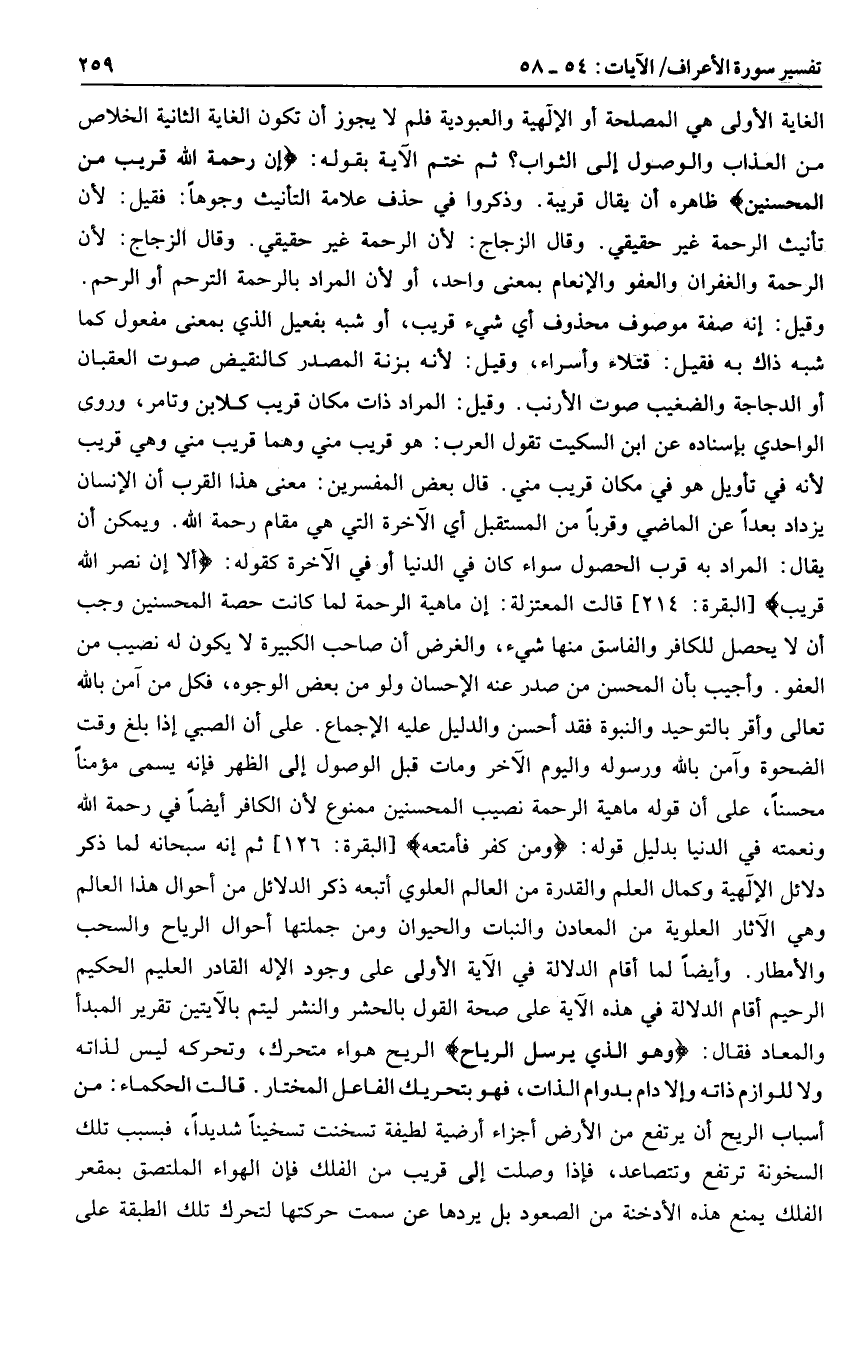 وقيل: إنه صفة موصوف محذوف أي شيء قريب، أو شبه بفعيل الذي بمعنى مفعول كما شبه ذاك به فقيل: قتلاء وأسراء، وقيل: لأنه بزنة المصدر كالنقيض صوت العقبان أو الدجاجة والضغيب صوت الأرنب. وقيل: المراد ذات مكان قريب كلابن وتامر، وروى الواحدي بإسناده عن ابن السكيت تقول العرب: هو قريب مني وهما قريب مني وهي قريب لأنه في تأويل هو في مكان قريب مني. قال بعض المفسرين: معنى هذا القرب أن الإنسان يزداد بعدا عن الماضي وقربا من المستقبل أي الآخرة التي هي مقام رحمة الله. ويمكن أن يقال: المراد به قرب الحصول سواء كان في الدنيا أو في الآخرة كقوله: أَلا إِنَّ نَصْرَ اللَّهِ قَرِيبٌ [البقرة: 214] قالت المعتزلة: إن ماهية الرحمة لما كانت حصة المحسنين وجب أن لا يحصل للكافر والفاسق منها شيء، والغرض أن صاحب الكبيرة لا يكون له نصيب من العفو. وأجيب بأن المحسن من صدر عنه الإحسان ولو من بعض الوجوه، فكل من آمن بالله تعالى وأقر بالتوحيد والنبوة فقد أحسن والدليل عليه الإجماع. على أن الصبي إذا بلغ وقت الضحوة وآمن بالله ورسوله واليوم الآخر ومات قبل الوصول إلى الظهر فإنه يسمى مؤمنا محسنا، على أن قوله ماهية الرحمة نصيب المحسنين ممنوع لأن الكافر أيضا في رحمة الله ونعمته في الدنيا بدليل قوله: وَمَنْ كَفَرَ فَأُمَتِّعُهُ [البقرة: 126] ثم إنه سبحانه لما ذكر دلائل الإلهية وكمال العلم والقدرة من العالم العلوي أتبعه ذكر الدلائل من أحوال هذا العالم وهي الآثار العلوية من المعادن والنبات والحيوان ومن جملتها أحوال الرياح والسحب والأمطار. وأيضا لما أقام الدلالة في الآية الأولى على وجود الإله القادر العليم الحكيم الرحيم أقام الدلالة في هذه الآية على صحة القول بالحشر والنشر ليتم بالآيتين تقرير المبدأ والمعاد فقال: وَهُوَ الَّذِي يُرْسِلُ الرِّياحَ الريح هواء متحرك، وتحركه ليس لذاته ولا للوازم ذاته وإلا دام بدوام الذات، فهو بتحريك الفاعل المختار. قالت الحكماء: من أسباب الريح أن يرتفع من الأرض أجزاء أرضية لطيفة تسخنت تسخينا شديدا، فبسبب تلك السخونة ترتفع وتتصاعد، فإذا وصلت إلى قريب من الفلك فإن الهواء الملتصق بمقعر الفلك يمنع هذه الأدخنة من الصعود بل يردها عن سمت حركتها لتحرك تلك الطبقة على