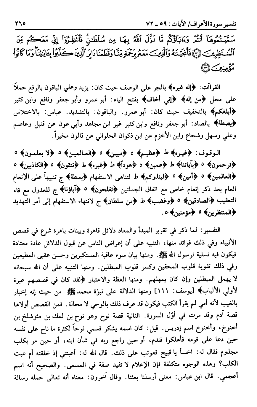 غَيْرُهُ ط عَظِيمٍ هـ مُبِينٍ هـ الْعالَمِينَ هـ لا يعلمون هـ تُرْحَمُونَ هـ بِآياتِنا ط عَمِينَ هـ هُوداً ط غَيْرُهُ ط تَتَّقُونَ هـ الْكاذِبِينَ هـ الْعالَمِينَ هـ أَمِينٌ هـ لِيُنْذِرَكُمْ ط لتناهى الاستفهام بسطة ج تنبيها على الإنعام العام بعد ذكر إنعام خاص مع اتفاق الجملتين تُفْلِحُونَ هـ آباؤُنا ج للعدول مع فاء التعقيب الصَّادِقِينَ هـ وَغَضَبٌ ط مِنْ سُلْطانٍ ج لانتهاء الاستفهام إلى أمر التهديد الْمُنْتَظِرِينَ هـ مُؤْمِنِينَ هـ.