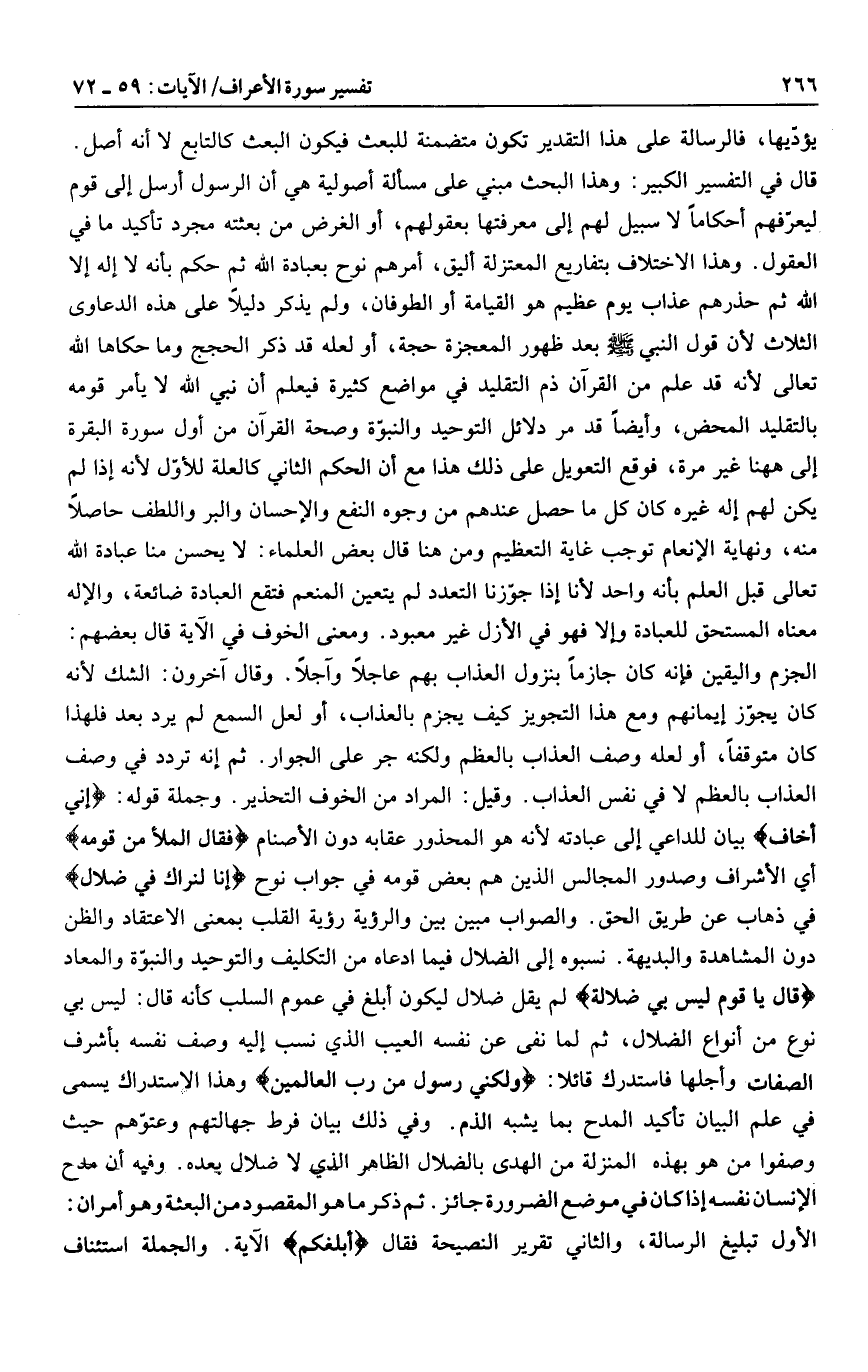 الجزم واليقين فإنه كان جازما بنزول العذاب بهم عاجلا وآجلا. وقال آخرون: الشك لأنه كان يجوّز إيمانهم ومع هذا التجويز كيف يجزم بالعذاب، أو لعل السمع لم يرد بعد فلهذا كان متوقفا، أو لعله وصف العذاب بالعظم ولكنه جر على الجوار. ثم إنه تردد في وصف العذاب بالعظم لا في نفس العذاب. وقيل: المراد من الخوف التحذير. وجملة قوله: إِنِّي أَخافُ بيان للداعي إلى عبادته لأنه هو المحذور عقابه دون الأصنام قالَ الْمَلَأُ مِنْ قَوْمِهِ أي الأشراف وصدور المجالس الذين هم بعض قومه في جواب نوح إِنَّا لَنَراكَ فِي ضَلالٍ في ذهاب عن طريق الحق. والصواب مبين بين والرؤية رؤية القلب بمعنى الاعتقاد والظن دون المشاهدة والبديهة. نسبوه إلى الضلال فيما ادعاه من التكليف والتوحيد والنبوّة والمعاد قالَ يا قَوْمِ لَيْسَ بِي ضَلالَةٌ لم يقل ضلال ليكون أبلغ في عموم السلب كأنه قال: ليس بي نوع من أنواع الضلال، ثم لما نفى عن نفسه العيب الذي نسب إليه وصف نفسه بأشرف الصفات وأجلها فاستدرك قائلا: وَلكِنِّي رَسُولٌ مِنْ رَبِّ الْعالَمِينَ وهذا الاستدراك يسمى في علم البيان تأكيد المدح بما يشبه الذم. وفي ذلك بيان فرط جهالتهم وعتوّهم حيث وصفوا من هو بهذه المنزلة من الهدى بالضلال الظاهر الذي لا ضلال بعده. وفيه أن مدح الإنسان نفسه إذا كان في موضع الضرورة جائز. ثم ذكر ما هو المقصود من البعثة وهو أمران: