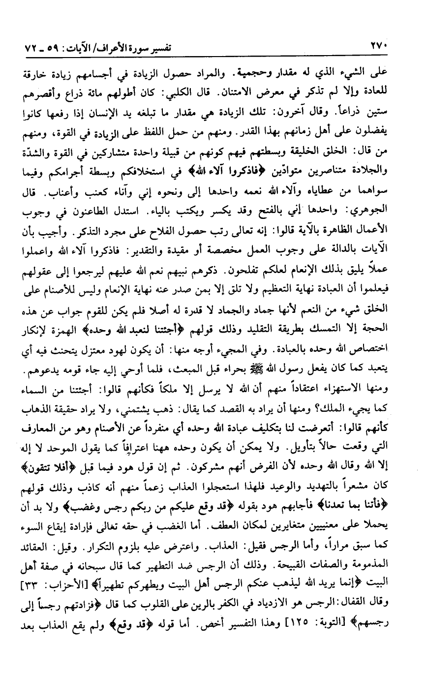 على الشيء الذي له مقدار وحجمية. والمراد حصول الزيادة في أجسامهم زيادة خارقة للعادة وإلا لم تذكر في معرض الامتنان. قال الكلبي: كان أطولهم مائة ذراع وأقصرهم ستين ذراعا. وقال آخرون: تلك الزيادة هي مقدار ما تبلغه يد الإنسان إذا رفعها كانوا يفضلون على أهل زمانهم بهذا القدر. ومنهم من حمل اللفظ على الزيادة في القوة، ومنهم من قال: الخلق الخليقة وبسطتهم فيهم كونهم من قبيلة واحدة متشاركين في القوة والشدّة والجلادة متناصرين متوادّين فَاذْكُرُوا آلاءَ اللَّهِ في استخلافكم وبسطة أجرامكم وفيما سواهما من عطاياه وآلاء الله نعمه واحدها إلى ونحوه إني وآناء كعنب وأعناب. قال الجوهري: واحدها إني بالفتح وقد يكسر ويكتب بالياء. استدل الطاعنون في وجوب الأعمال الظاهرة بالآية قالوا: إنه تعالى رتب حصول الفلاح على مجرد التذكر. وأجيب بأن الآيات بالدالة على وجوب العمل مخصصة أو مقيدة والتقدير: فاذكروا آلاء الله واعملوا عملا يليق بذلك الإنعام لعلكم تفلحون. ذكرهم نبيهم نعم الله عليهم ليرجعوا إلى عقولهم فيعلموا أن العبادة نهاية التعظيم ولا تلق إلا بمن صدر عنه نهاية الإنعام وليس للأصنام على الخلق شيء من النعم لأنها جماد والجماد لا قدرة له أصلا فلم يكن للقوم جواب عن هذه الحجة إلا التمسك بطريقة التقليد وذلك قولهم أَجِئْتَنا لِنَعْبُدَ اللَّهَ وَحْدَهُ الهمزة لإنكار اختصاص الله وحده بالعبادة. وفي المجيء أوجه منها: أن يكون لهود معتزل يتحنث فيه أي يتعبد كما كان يفعل رسول الله صلى الله عليه وسلم بحراء قبل المبعث، فلما أوحي إليه جاء قومه يدعوهم.