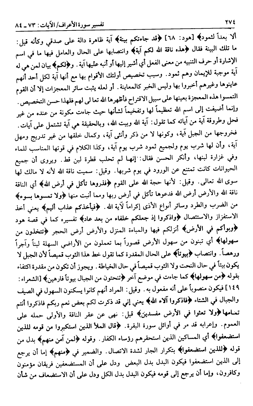 وقيل: سميت ناقة الله لأنه لا مالك لها سوى الله تعالى. وقيل: لأنها حجة الله على القوم فَذَرُوها تَأْكُلْ فِي أَرْضِ اللَّهِ أي الناقة ناقة الله والأرض أرض الله فدعوها تأكل في أرض ربها ومما أنبت منها وَلا تَمَسُّوها بِسُوءٍ من الضرب والطرد وسائر أنواع الأذى إكراما لآية الله. فَيَأْخُذَكُمْ عَذابٌ أَلِيمٌ يعني أخذ الاستفزاز والاستئصال وَاذْكُرُوا إِذْ جَعَلَكُمْ خُلَفاءَ مِنْ بَعْدِ عادٍ تفسيره كما في قصة هود وَبَوَّأَكُمْ فِي الْأَرْضِ أنزلكم فيها والمباءة المنزل والأرض أرض الحجر تَتَّخِذُونَ مِنْ سُهُولِها أي تبنون من سهول الأرض قصورا بما تعملون من الأراضي السهلة لبنا وآجرا ورهصا. وانتصاب بُيُوتاً على الحال المقدرة كما تقول خط هذا الثوب قميصا لأن الجبل لا يكون بيتا في حال النحت ولا الثوب قميصا في حال الخياطة. ويجوز أن تكون من مقدرة اكتفاء بقوله مِنْ سُهُولِها كما جاءت في موضع آخر تَنْحِتُونَ مِنَ الْجِبالِ بُيُوتاً فارِهِينَ [الشعراء: