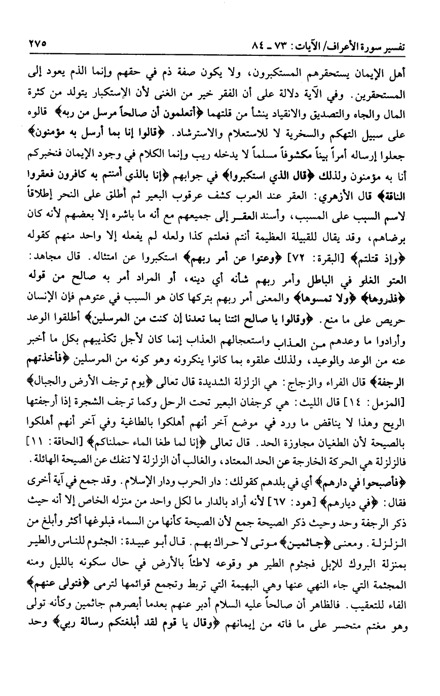 أهل الإيمان يستحقرهم المستكبرون، ولا يكون صفة ذم في حقهم وإنما الذم يعود إلى المستحقرين. وفي الآية دلالة على أن الفقر خير من الغنى لأن الاستكبار يتولد من كثرة المال والجاه والتصديق والانقياد ينشأ من قلتهما أَتَعْلَمُونَ أَنَّ صالِحاً مُرْسَلٌ مِنْ رَبِّهِ قالوه على سبيل التهكم والسخرية لا للاستعلام والاسترشاد. قالُوا إِنَّا بِما أُرْسِلَ بِهِ مُؤْمِنُونَ جعلوا إرساله أمرا بينا مكشوفا مسلما لا يدخله ريب وإنما الكلام في وجود الإيمان فنخبركم أنا به مؤمنون ولذلك قالَ الَّذِينَ اسْتَكْبَرُوا في جوابهم إِنَّا بِالَّذِي آمَنْتُمْ بِهِ كافِرُونَ فَعَقَرُوا النَّاقَةَ قال الأزهري: العقر عند العرب كشف عرقوب البعير ثم أطلق على النحر إطلاقا لاسم السبب على المسبب، وأسند العقر إلى جميعهم مع أنه ما باشره إلا بعضهم لأنه كان برضاهم، وقد يقال للقبيلة العظيمة أنتم فعلتم كذا ولعله لم يفعله إلا واحد منهم كقوله وَإِذْ قَتَلْتُمْ [البقرة: 72] وَعَتَوْا عَنْ أَمْرِ رَبِّهِمْ استكبروا عن امتثاله. قال مجاهد: