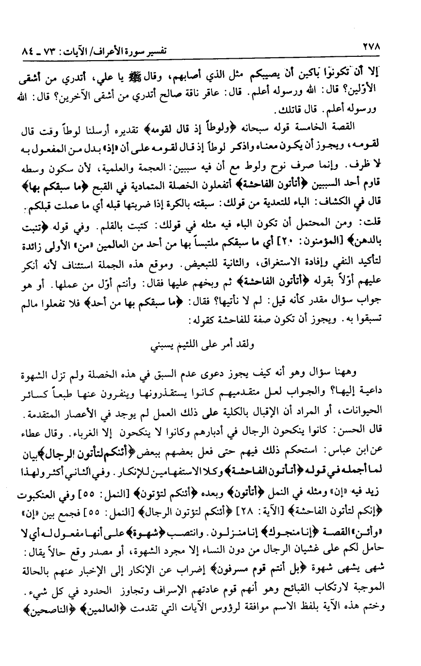 القصة الخامسة قوله سبحانه وَلُوطاً إِذْ قالَ لِقَوْمِهِ تقديره أرسلنا لوطا وقت قال لقومه، ويجوز أن يكون معناه واذكر لوطا إذ قال لقومه على أن «إذ» بدل من المفعول به لا ظرف. وإنما صرف نوح ولوط مع أن فيه سببين: العجمة والعلمية، لأن سكون وسطه قاوم أحد السببين أَتَأْتُونَ الْفاحِشَةَ أتفعلون الخصلة المتمادية في القبح ما سَبَقَكُمْ بِها قال في الكشاف: الباء للتعدية من قولك: سبقته بالكرة إذا ضربتها قبله أي ما عملت قبلكم.