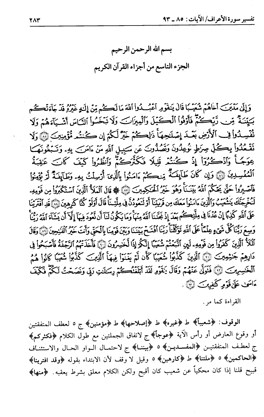 بسم الله الرحمن الرحيم الجزء التاسع من أجزاء القرآن الكريم