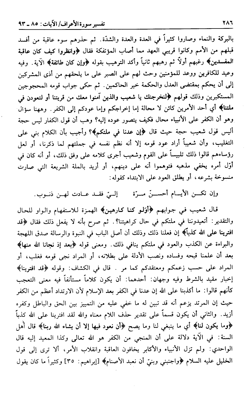 بالبركة والنماء وصاروا كثيرا في العدة والعدة والشدّة. ثم حذرهم سوء عاقبة من أفسد قبلهم من الأمم وكانوا قريبي العهد مما أصاب المؤتفكة فقال وَانْظُرُوا كَيْفَ كانَ عاقِبَةُ الْمُفْسِدِينَ رغبهم أولا ثم رهبهم ثانيا وأكد الترهيب بقوله وَإِنْ كانَ طائِفَةٌ الآية. وفيه وعيد للكافرين ووعد للمؤمنين وحث لهم على الصبر على ما يلحقهم من أذى المشركين إلى أن يحكم بمقتضى العدل والحكمة خير الحاكمين. ثم حكى جواب قومه المحجوجين المستكبرين وذلك قولهم لَنُخْرِجَنَّكَ يا شُعَيْبُ وَالَّذِينَ آمَنُوا مَعَكَ مِنْ قَرْيَتِنا أَوْ لَتَعُودُنَّ فِي مِلَّتِنا أي أحد الأمرين كائن لا محالة إما إخراجكم وإما عودكم إلى الكفر. وهاهنا سؤال وهو أن الكفر على الأنبياء محال فكيف يتصور عوده إليه؟ وهب أن قول الكفار ليس حجة أليس قول شعيب حجة حيث قال إِنْ عُدْنا فِي مِلَّتِكُمْ؟ وأجيب بأن الكلام بني على التغليب، وأن شعيبا أراد عود قومه إلا أنه نظم نفسه في جملتهم لما ذكرنا، أو لعل رؤساءهم قالوا ذلك تلبيسا على القوم وشعيب أجرى كلامه على وفق ذلك، أو أنه كان في أوّل أمره يخفي مذهبه فتوهموا أنه على دينهم، أو أريد بالملة الشريعة التي صارت منسوخة بشرعه، أو يطلق العود على الابتداء كقوله: