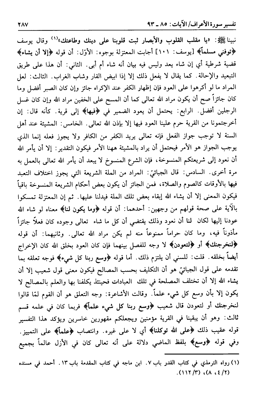 وقال يوسف تَوَفَّنِي مُسْلِماً [يوسف: 101] أجابت المعتزلة بوجوه: الأوّل: أن قوله إِلَّا أَنْ يَشاءَ قضية شرطية أي إن شاء يعد وليس فيه بيان أنه شاء أم أبى. الثاني: أن هذا على طريق التبعيد والإحالة. كما يقال لا يفعل ذلك إلا إذا ابيض القار وشاب الغراب. الثالث: لعل المراد ما لو أكرهوا على العود فإن إظهار الكفر عند الإكراه جائز وإن كان الصبر أفضل وما كان جائزا صح أن يكون مراد الله تعالى كما أن المسح على الخفين مراد الله وإن كان غسل الرجلين أفضل. الرابع: يحتمل أن يعود الضمير في فِيهَا إلى قرية. كأنه قال: إن أخرجتمونا من القرية حرم علينا العود فيها إلا بإذن الله تعالى. الخامس: المشيئة عند أهل السنة لا توجب جواز الفعل فإنه تعالى يريد الكفر من الكافر ولا يجوز فعله إنما الذي يوجب الجواز هو الأمر فيحتمل أن يراد بالمشيئة هاهنا الأمر فيكون التقدير: إلا أن يأمر الله أن نعود إلى شريعتكم المنسوخة، فإن الشرع المنسوخ لا يبعد أن يأمر الله تعالى بالعمل به مرة أخرى. السادس: قال الجبائيّ: المراد من الملة الشريعة التي يجوز اختلاف التعبد فيها بالأوقات كالصوم والصلاة، فمن الجائز أن يكون بعض أحكام الشريعة المنسوخة باقيا فيكون المعنى إلا أن يشاء الله إبقاء بعض تلك الملة فيدلنا عليها. ثم إن المعتزلة تمسكوا بالآية على صحة قولهم من وجهين: أحدهما: أن قوله وَما يَكُونُ لَنا معناه لو شاء الله عودنا إليها لكان لنا أن نعود وذلك يقتضي أن كل ما شاء تعالى وجوده كان فعلا جائزا مأذونا فيه، وما كان حراما ممنوعا منه لم يكن مراد الله تعالى. وثانيهما: أن قوله لَنُخْرِجَنَّكَ أو لَتَعُودُنَّ لا وجه للفصل بينهما فإن كان العود بخلق الله كان الإخراج أيضا بخلقه. قلت: للسني أن يلتزم ذلك. أما قوله وَسِعَ رَبُّنا كُلَّ شَيْءٍ فوجه تعلقه بما تقدمه على قول الجبائيّ هو أن التكليف بحسب المصالح فيكون معنى قول شعيب إلا أن يشاء الله إلا أن تختلف المصلحة في تلك العبادات فحينئذ يكلفنا بها والعلم بالمصالح لا يكون إلا بأن وسع كل شيء علما. وقالت الأشاعرة: وجه التعلق هو أن القوم لمّا قالوا لنخرجنك أو لتعودن قال شعيب وَسِعَ رَبُّنا كُلَّ شَيْءٍ عِلْماً فربما كان في علمه قسم ثالث: وهو أن يبقينا في القرية مؤمنين ويجعلكم مقهورين خاسرين ويؤكد هذا التفسير قوله عقيب ذلك عَلَى اللَّهِ تَوَكَّلْنا أي لا على غيره. وانتصاب عِلْماً على التمييز.