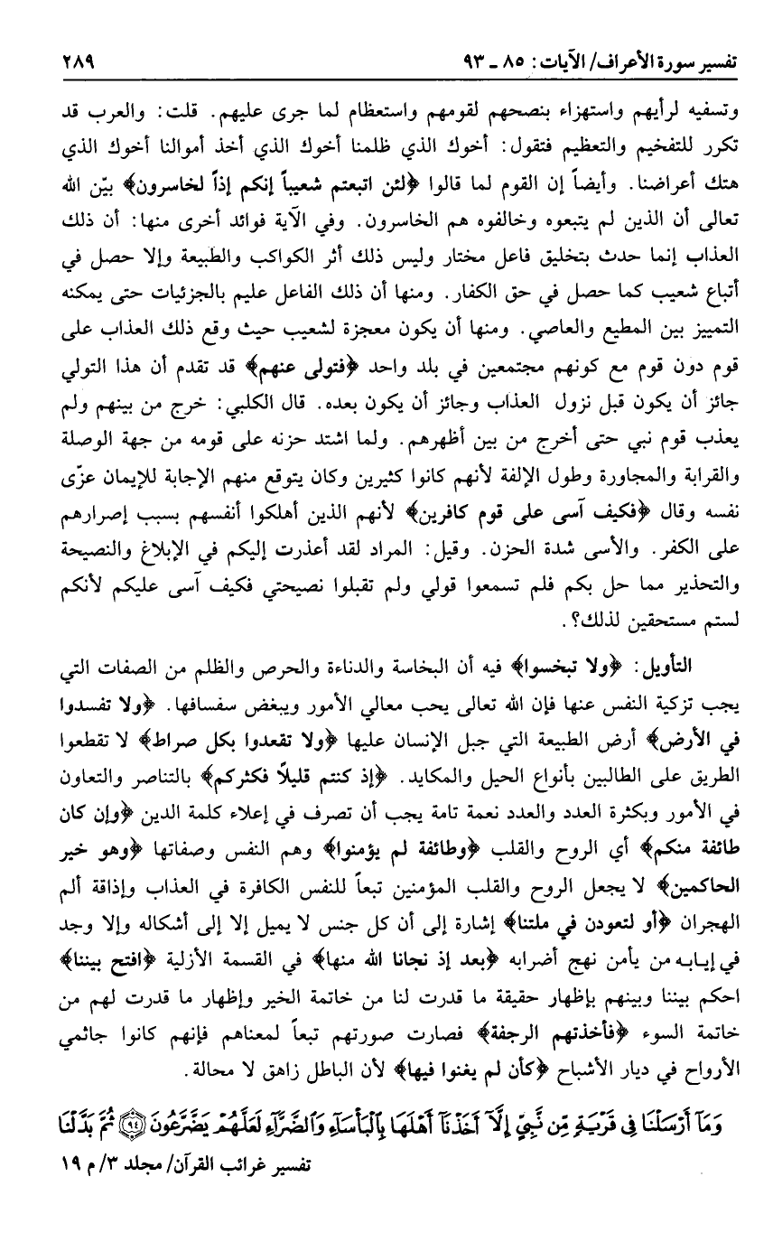 وَلا تَبْخَسُوا فيه أن البخاسة والدناءة والحرص والظلم من الصفات التي يجب تزكية النفس عنها فإن الله تعالى يحب معالي الأمور ويبغض سفسافها. وَلا تُفْسِدُوا فِي الْأَرْضِ أرض الطبيعة التي جبل الإنسان عليها وَلا تَقْعُدُوا بِكُلِّ صِراطٍ لا تقطعوا الطريق على الطالبين بأنواع الحيل والمكايد. إِذْ كُنْتُمْ قَلِيلًا فَكَثَّرَكُمْ بالتناصر والتعاون في الأمور وبكثرة العدد والعدد نعمة تامة يجب أن تصرف في إعلاء كلمة الدين وَإِنْ كانَ طائِفَةٌ مِنْكُمْ أي الروح والقلب وَطائِفَةٌ لَمْ يُؤْمِنُوا وهم النفس وصفاتها وَهُوَ خَيْرُ الْحاكِمِينَ لا يجعل الروح والقلب المؤمنين تبعا للنفس الكافرة في العذاب وإذاقة ألم الهجران أَوْ لَتَعُودُنَّ فِي مِلَّتِنا إشارة إلى أن كل جنس لا يميل إلا إلى أشكاله وإلا وجد في إيابه من يأمن نهج أضرابه بَعْدَ إِذْ نَجَّانَا اللَّهُ مِنْها في القسمة الأزلية افْتَحْ بَيْنَنا احكم بيننا وبينهم بإظهار حقيقة ما قدرت لنا من خاتمة الخير وإظهار ما قدرت لهم من خاتمة السوء فَأَخَذَتْهُمُ الرَّجْفَةُ فصارت صورتهم تبعا لمعناهم فإنهم كانوا جاثمي الأرواح في ديار الأشباح كَأَنْ لَمْ يَغْنَوْا فِيهَا لأن الباطل زاهق لا محالة.