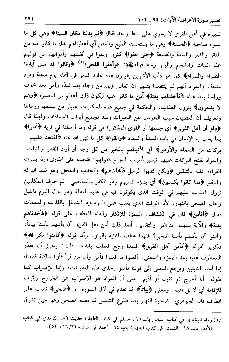 والمراد بفتح البركات عليهم تيسير أسباب النجاح كقولهم: فتحت على القارئ إذا يسرت القراءة عليه بالتلقين وَلكِنْ كَذَّبُوا الرسل فَأَخَذْناهُمْ بالجدب والمحل وهو ضد البركة والخير بِما كانُوا يَكْسِبُونَ أي بشؤم كسبهم وهو الكفر والمعاصي. ثم خوف المكلفين نزول العذاب عليهم في الوقت الذي يكونون فيه في غاية الغفلة وهو حال النوم بالليل وحال الضحى بالنهار، لأنه الوقت الذي يغلب على المرء فيه التشاغل باللذات والمهمات فقال أَفَأَمِنَ قال في الكشاف: الهمزة للإنكار والفاء للعطف على قوله فَأَخَذْناهُمْ بَغْتَةً والآية بينهما اعتراض والتقدير: أبعد ذلك أمن أهل القرى أن يأتيهم بأسنا بياتا، وأمنوا أن يأتيهم بأسنا ضحى؟ فلهذا عطف الثانية بالواو. وأما قوله أَفَأَمِنُوا مَكْرَ اللَّهِ فتكرير لقوله أَفَأَمِنَ أَهْلُ الْقُرى فلهذا رجع فعطف بالفاء. قلت: يجوز أن يقدّر المعطوف عليه بعد الهمزة والمعنى: أفعلوا ما فعلوا فأمن وأما من قرأ «أو» ساكنة فمعناه إما أحد الشيئين ويرجع المعنى إلى قولنا فأمنوا إحدى هذه العقوبات، وإما للإضراب كما تقول: أنا أخرج ثم تقول أو أقيم. على أن المراد هو الإضراب عن الخروج وإثبات للإقامة أي لا بل أقيم. ومعنى بَياتاً قد تقدم في أوّل السورة. وضُحًى نصب على الظرف قال الجوهري: ضحوة النهار بعد طلوع الشمس ثم بعده الضحى وهو حين تشرق
