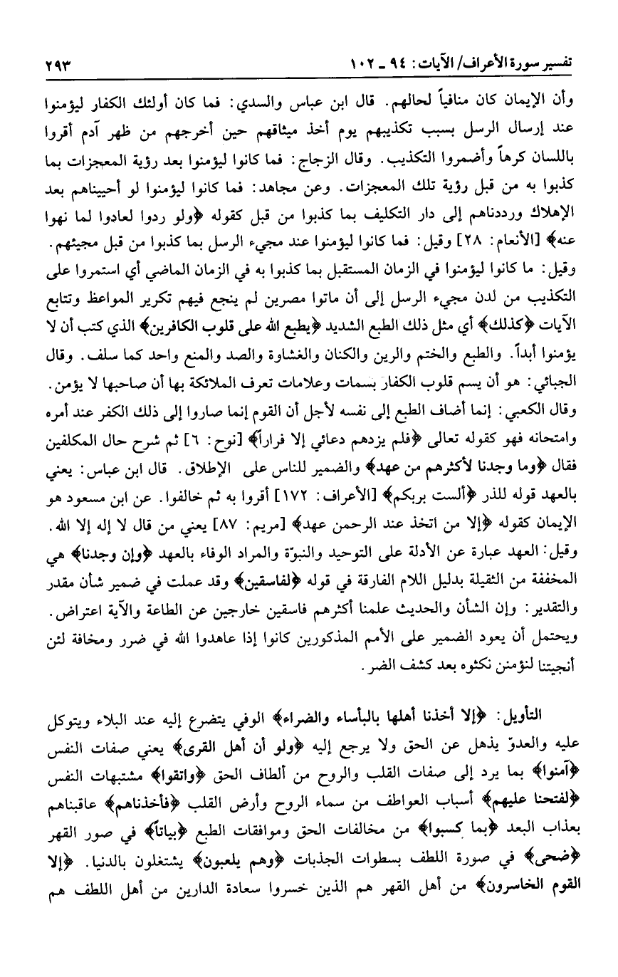 إِلَّا أَخَذْنا أَهْلَها بِالْبَأْساءِ وَالضَّرَّاءِ الوفي يتضرع إليه عند البلاء ويتوكل عليه والعدوّ يذهل عن الحق ولا يرجع إليه وَلَوْ أَنَّ أَهْلَ الْقُرى يعني صفات النفس آمَنُوا بما يرد إلى صفات القلب والروح من ألطاف الحق وَاتَّقَوْا مشتبهات النفس لَفَتَحْنا عَلَيْهِمْ أسباب العواطف من سماء الروح وأرض القلب فَأَخَذْناهُمْ عاقبناهم بعذاب البعد بما كسبوا من مخالفات الحق وموافقات الطبع بَياتاً في صور القهر ضُحًى في صورة اللطف بسطوات الجذبات وَهُمْ يَلْعَبُونَ يشتغلون بالدنيا. إِلَّا الْقَوْمُ الْخاسِرُونَ من أهل القهر هم الذين خسروا سعادة الدارين من أهل اللطف هم