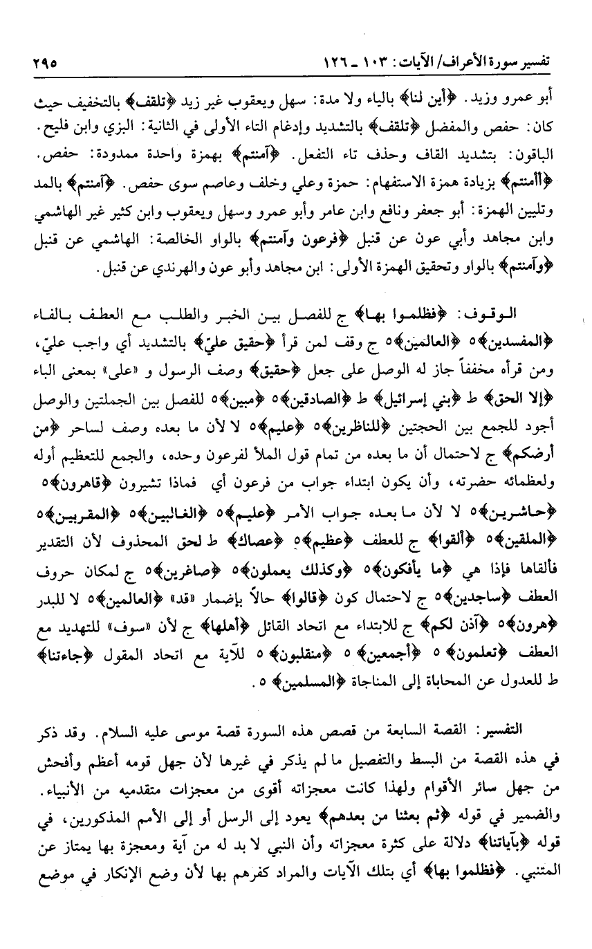 فَظَلَمُوا بِها ج للفصل بين الخبر والطلب مع العطف بالفاء الْمُفْسِدِينَ هـ الْعالَمِينَ هـ ج وقف لمن قرأ حَقِيقٌ عَلى بالتشديد أي واجب عليّ، ومن قرأه مخففا جاز له الوصل على جعل حَقِيقٌ وصف الرسول و «على» بمعنى الباء إِلَّا الْحَقَّ ط بَنِي إِسْرائِيلَ ط الصَّادِقِينَ هـ مُبِينٌ هـ للفصل بين الجملتين والوصل أجود للجمع بين الحجتين لِلنَّاظِرِينَ هـ عَلِيمٍ هـ لا لأن ما بعده وصف لساحر مِنْ أَرْضِكُمْ ج لاحتمال أن ما بعده من تمام قول الملأ لفرعون وحده، والجمع للتعظيم أوله ولعظمائه حضرته، وأن يكون ابتداء جواب من فرعون أي فماذا تشيرون قاهِرُونَ هـ حاشِرِينَ هـ لا لأن ما بعده جواب الأمر عَلِيمٍ هـ الْغالِبِينَ هـ الْمُقَرَّبِينَ هـ الْمُلْقِينَ هـ أَلْقُوا ج للعطف عَظِيمٍ هـ عَصاكَ ط لحق المحذوف لأن التقدير فألقاها فإذا هي ما يَأْفِكُونَ هـ ما كانُوا يَعْمَلُونَ هـ صاغِرِينَ هـ ج لمكان حروف العطف ساجِدِينَ هـ ج لاحتمال كون قالُوا حالا بإضمار «قد» الْعالَمِينَ هـ لا للبدر هارُونَ هـ آذَنَ لَكُمْ ج للابتداء مع اتحاد القائل أَهْلَها ج لأن «سوف» للتهديد مع العطف تَعْلَمُونَ هـ أَجْمَعِينَ هـ مُنْقَلِبُونَ هـ للآية مع اتحاد المقول جاءَتْنا ط للعدول عن المحاباة إلى المناجاة مُسْلِمِينَ هـ.