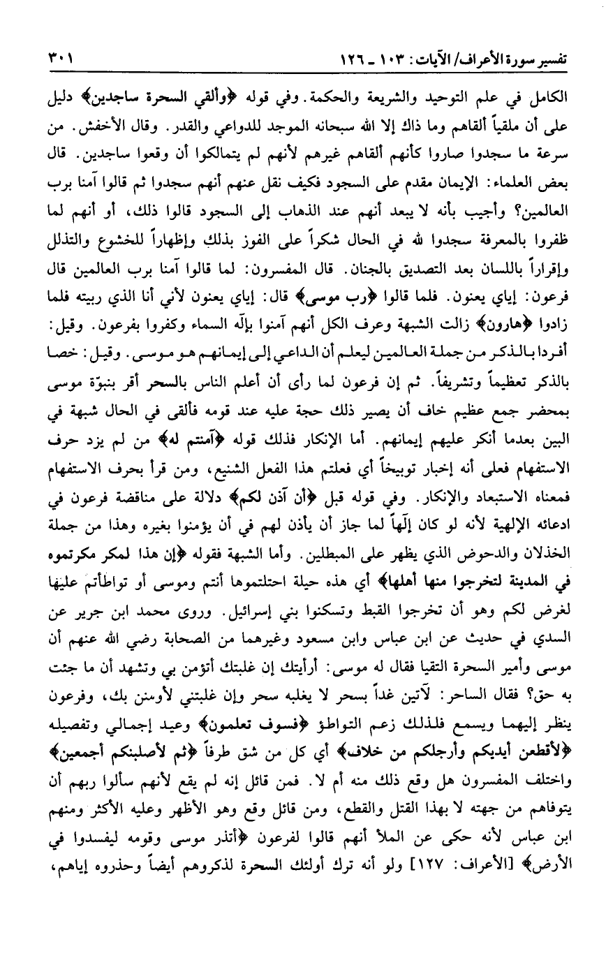 الكامل في علم التوحيد والشريعة والحكمة. وفي قوله وَأُلْقِيَ السَّحَرَةُ ساجِدِينَ دليل على أن ملقيا ألقاهم وما ذاك إلا الله سبحانه الموجد للدواعي والقدر. وقال الأخفش. من سرعة ما سجدوا صاروا كأنهم ألقاهم غيرهم لأنهم لم يتمالكوا أن وقعوا ساجدين. قال بعض العلماء: الإيمان مقدم على السجود فكيف نقل عنهم أنهم سجدوا ثم قالوا آمنا برب العالمين؟ وأجيب بأنه لا يبعد أنهم عند الذهاب إلى السجود قالوا ذلك، أو أنهم لما ظفروا بالمعرفة سجدوا لله في الحال شكرا على الفوز بذلك وإظهارا للخشوع والتذلل وإقرارا باللسان بعد التصديق بالجنان. قال المفسرون: لما قالوا آمنا برب العالمين قال فرعون: إياي يعنون. فلما قالوا رَبِّ مُوسى قال: إياي يعنون لأني أنا الذي ربيته فلما زادوا هارُونَ زالت الشبهة وعرف الكل أنهم آمنوا بإله السماء وكفروا بفرعون. وقيل: