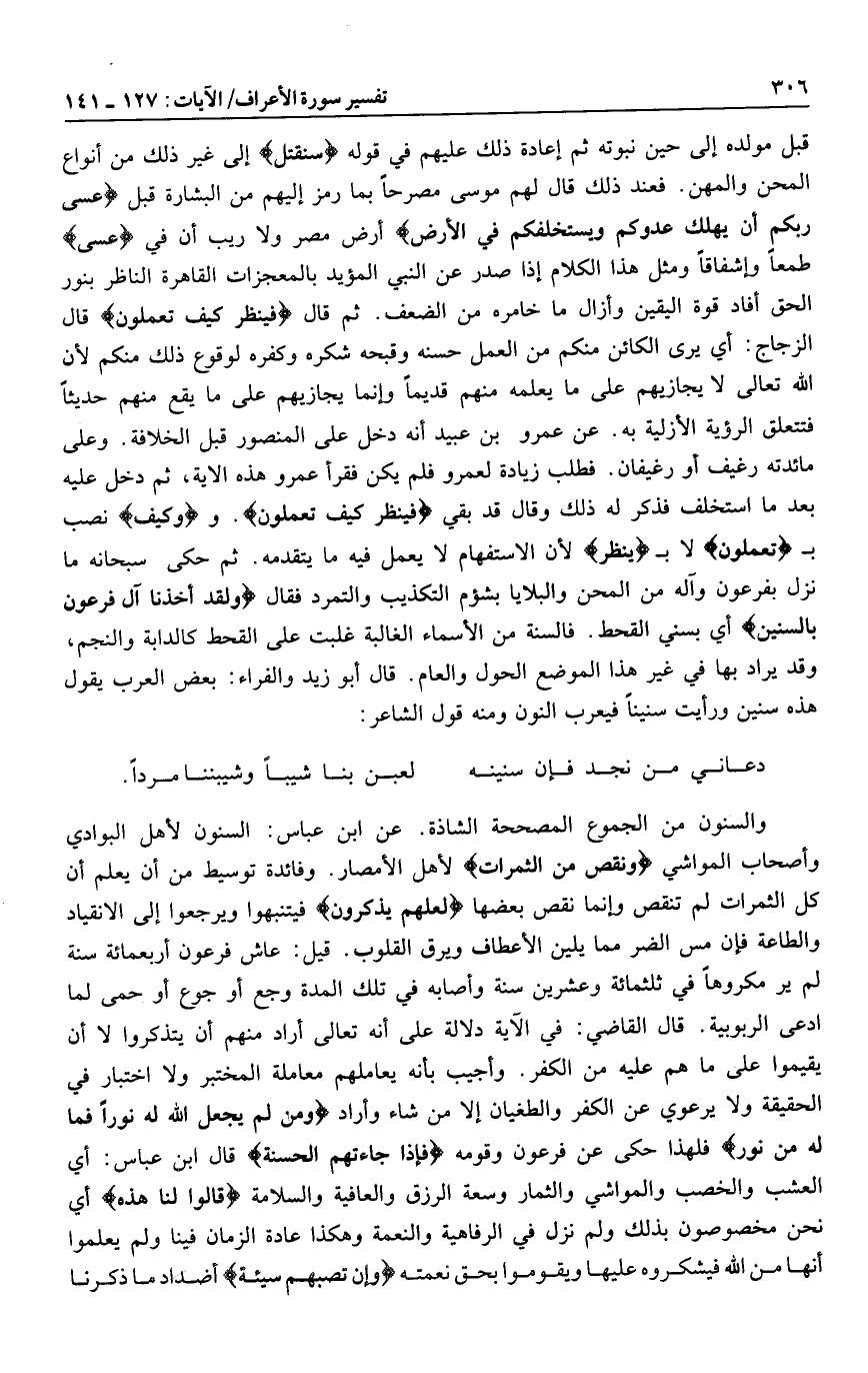 قبل مولده إلى حين نبوته ثم إعادة ذلك عليهم في قوله سَنُقَتِّلُ إلى غير ذلك من أنواع المحن والمهن. فعند ذلك قال لهم موسى مصرحا بما رمز إليهم من البشارة قبل عَسى رَبُّكُمْ أَنْ يُهْلِكَ عَدُوَّكُمْ وَيَسْتَخْلِفَكُمْ فِي الْأَرْضِ أرض مصر ولا ريب أن في عَسى طمعا وإشفاقا ومثل هذا الكلام إذا صدر عن النبي المؤيد بالمعجزات القاهرة الناظر بنور الحق أفاد قوة اليقين وأزال ما خامره من الضعف. ثم قال فَيَنْظُرَ كَيْفَ تَعْمَلُونَ قال الزجاج: أي يرى الكائن منكم من العمل حسنه وقبحه شكره وكفره لوقوع ذلك منكم لأن الله تعالى لا يجازيهم على ما يعلمه منهم قديما وإنما يجازيهم على ما يقع منهم حديثا فتتعلق الرؤية الأزلية به. عن عمرو بن عبيد أنه دخل على المنصور قبل الخلافة. وعلى مائدته رغيف أو رغيفان. فطلب زيادة لعمرو فلم يكن فقرأ عمرو هذه الاية، ثم دخل عليه بعد ما استخلف فذكر له ذلك وقال قد بقي فَيَنْظُرَ كَيْفَ تَعْمَلُونَ. وكَيْفَ نصب ب تَعْمَلُونَ لا ب فَيَنْظُرَ لأن الاستفهام لا يعمل فيه ما يتقدمه. ثم حكى سبحانه ما نزل بفرعون وآله من المحن والبلايا بشؤم التكذيب والتمرد فقال وَلَقَدْ أَخَذْنا آلَ فِرْعَوْنَ بِالسِّنِينَ أي بسني القحط. فالسنة من الأسماء الغالبة غلبت على القحط كالدابة والنجم، وقد يراد بها في غير هذا الموضع الحول والعام. قال أبو زيد والفراء: بعض العرب يقول هذه سنين ورأيت سنينا فيعرب النون ومنه قول الشاعر: