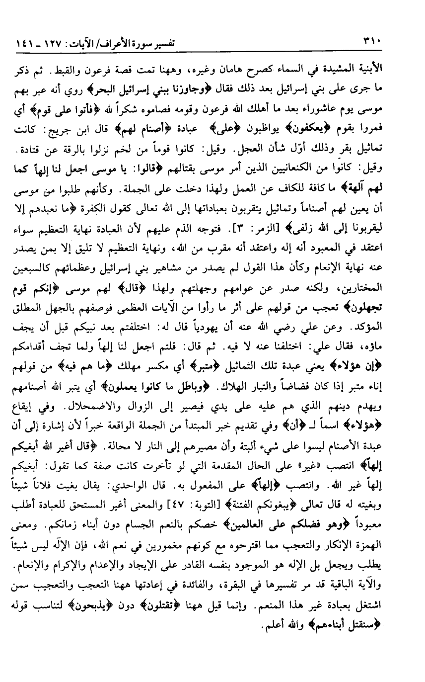 إِنَّ هؤُلاءِ يعني عبدة تلك التماثيل مُتَبَّرٌ أي مكسر مهلك ما هُمْ فِيهِ من قولهم إناء متبر إذا كان فضاضا والتبار الهلاك. وَباطِلٌ ما كانُوا يَعْمَلُونَ أي يتبر الله أصنامهم ويهدم دينهم الذي هم عليه على يدي فيصير إلى الزوال والاضمحلال. وفي إيقاع هؤُلاءِ اسما ل إِنَّ وفي تقديم خبر المبتدأ من الجملة الواقعة خبرا لأن إشارة إلى أن عبدة الأصنام ليسوا على شيء البتة وأن مصيرهم إلى النار لا محالة. قالَ أَغَيْرَ اللَّهِ أَبْغِيكُمْ إِلهاً انتصب «غير» على الحال المقدمة التي لو تأخرت كانت صفة كما تقول: أبغيكم إلها غير الله. وانتصب إِلهاً على المفعول به. قال الواحدي: يقال بغيت فلانا شيئا وبغيته له قال تعالى يَبْغُونَكُمُ الْفِتْنَةَ [التوبة: 47] والمعنى أغير المستحق للعبادة أطلب معبودا وَهُوَ فَضَّلَكُمْ عَلَى الْعالَمِينَ خصكم بالنعم الجسام دون أبناء زمانكم. ومعنى الهمزة الإنكار والتعجب مما اقترحوه مع كونهم مغمورين في نعم الله، فإن الإله ليس شيئا يطلب ويجعل بل الإله هو الموجود بنفسه القادر على الإيجاد والإعدام والإكرام والإنعام.