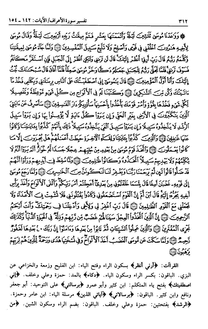 وَواعَدْنا مُوسى ثَلاثِينَ لَيْلَةً وَأَتْمَمْناها بِعَشْرٍ فَتَمَّ مِيقاتُ رَبِّهِ أَرْبَعِينَ لَيْلَةً وَقالَ مُوسى لِأَخِيهِ هارُونَ اخْلُفْنِي فِي قَوْمِي وَأَصْلِحْ وَلا تَتَّبِعْ سَبِيلَ الْمُفْسِدِينَ (142) وَلَمَّا جاءَ مُوسى لِمِيقاتِنا وَكَلَّمَهُ رَبُّهُ قالَ رَبِّ أَرِنِي أَنْظُرْ إِلَيْكَ قالَ لَنْ تَرانِي وَلكِنِ انْظُرْ إِلَى الْجَبَلِ فَإِنِ اسْتَقَرَّ مَكانَهُ فَسَوْفَ تَرانِي فَلَمَّا تَجَلَّى رَبُّهُ لِلْجَبَلِ جَعَلَهُ دَكًّا وَخَرَّ مُوسى صَعِقاً فَلَمَّا أَفاقَ قالَ سُبْحانَكَ تُبْتُ إِلَيْكَ وَأَنَا أَوَّلُ الْمُؤْمِنِينَ (143) قالَ يا مُوسى إِنِّي اصْطَفَيْتُكَ عَلَى النَّاسِ بِرِسالاتِي وَبِكَلامِي فَخُذْ ما آتَيْتُكَ وَكُنْ مِنَ الشَّاكِرِينَ (144) وَكَتَبْنا لَهُ فِي الْأَلْواحِ مِنْ كُلِّ شَيْءٍ مَوْعِظَةً وَتَفْصِيلاً لِكُلِّ شَيْءٍ فَخُذْها بِقُوَّةٍ وَأْمُرْ قَوْمَكَ يَأْخُذُوا بِأَحْسَنِها سَأُرِيكُمْ دارَ الْفاسِقِينَ (145) سَأَصْرِفُ عَنْ آياتِيَ الَّذِينَ يَتَكَبَّرُونَ فِي الْأَرْضِ بِغَيْرِ الْحَقِّ وَإِنْ يَرَوْا كُلَّ آيَةٍ لا يُؤْمِنُوا بِها وَإِنْ يَرَوْا سَبِيلَ الرُّشْدِ لا يَتَّخِذُوهُ سَبِيلاً وَإِنْ يَرَوْا سَبِيلَ الغَيِّ يَتَّخِذُوهُ سَبِيلاً ذلِكَ بِأَنَّهُمْ كَذَّبُوا بِآياتِنا وَكانُوا عَنْها غافِلِينَ (146)
