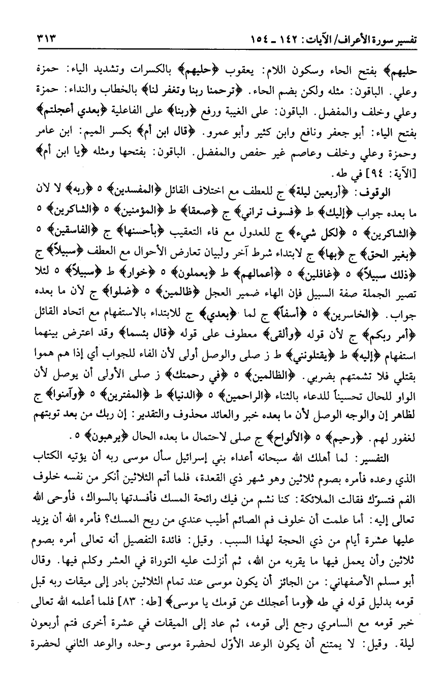 أَرْبَعِينَ لَيْلَةً ج للعطف مع اختلاف القائل الْمُفْسِدِينَ هـ رَبِّهِ لا لأن ما بعده جواب إِلَيْكَ ط فَسَوْفَ تَرانِي ج صَعِقاً ط الْمُؤْمِنِينَ هـ الشَّاكِرِينَ هـ الشَّاكِرِينَ هـ لِكُلِّ شَيْءٍ ج للعدول مع فاء التعقيب بِأَحْسَنِها ج الْفاسِقِينَ هـ بِغَيْرِ الْحَقِّ ج بِها ج لابتداء شرط آخر ولبيان تعارض الأحوال مع العطف سَبِيلًا ج ذلك سبيلا هـ غافِلِينَ هـ أَعْمالُهُمْ ط يَعْمَلُونَ هـ خُوارٌ ط سَبِيلًا هـ لئلا تصير الجملة صفة السبيل فإن الهاء ضمير العجل ظالِمِينَ هـ ضَلُّوا ج لأن ما بعده جواب. الْخاسِرِينَ هـ أَسِفاً ج لما بَعْدِي ج للابتداء بالاستفهام مع اتحاد القائل أَمْرَ رَبِّكُمْ ج لأن قوله وَأَلْقَى معطوف على قوله قالَ بِئْسَما وقد اعترض بينهما استفهام إِلَيْهِ ط يَقْتُلُونَنِي ط ز صلى والوصل أولى لأن الفاء للجواب أي إذا هم هموا بقتلي فلا تشمتهم بضربي. الظَّالِمِينَ هـ فِي رَحْمَتِكَ ز صلى الأولى أن يوصل لأن الواو للحال تحسينا للدعاء بالثناء الرَّاحِمِينَ هـ الدُّنْيا ط الْمُفْتَرِينَ هـ وَآمَنُوا ج لظاهر إن والوجه الوصل لأن ما بعده خبر والعائد محذوف والتقدير: إن ربك من بعد توبتهم لغفور لهم. رَحِيمٌ هـ الْأَلْواحَ ج صلى لاحتمال ما بعده الحال يَرْهَبُونَ هـ.